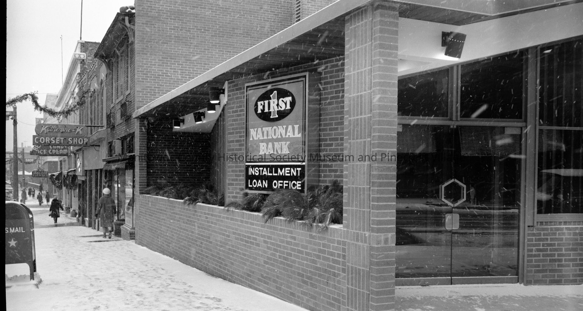 New First National Bank loan office southwest corner of North 8th and York Street Manitowoc. At left is KarmelKorn, 114; KatherineK corset Shop, 112; and Beerntsen's, 108 North 8th Street. Photograph taken on December 2nd, 1964.Made/Created