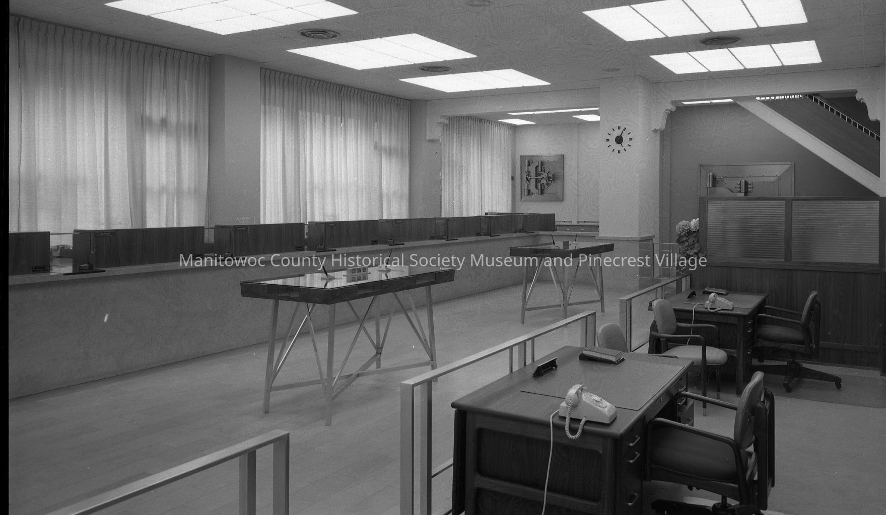Interior of remodeled First National Bank at 202 North 8th Street in Manitowoc. Photo is taken from looking from the front towards the teller stations. Photograph taken on May 5th, 1960.Made/Created