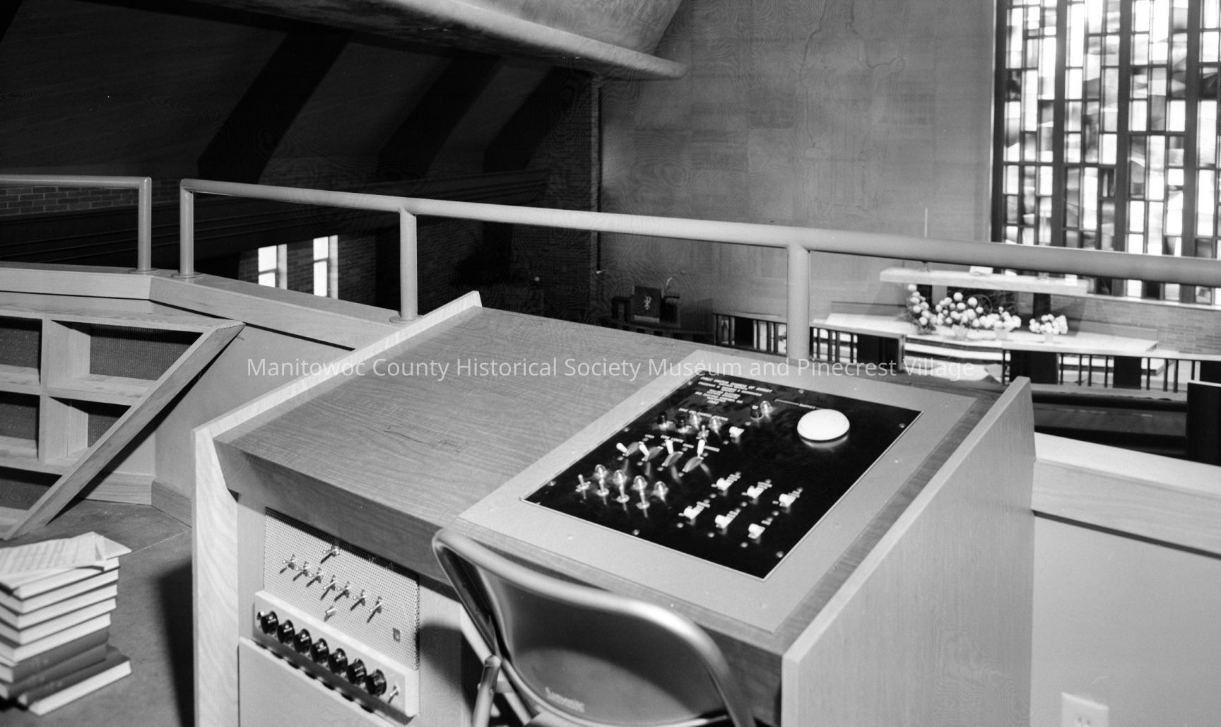 First Reformed Church of Christ, 3613 Waldo Blvd. Manitowoc; lights & sound center in choir loft. Photograph taken on June 26th, 1962.Made/Created