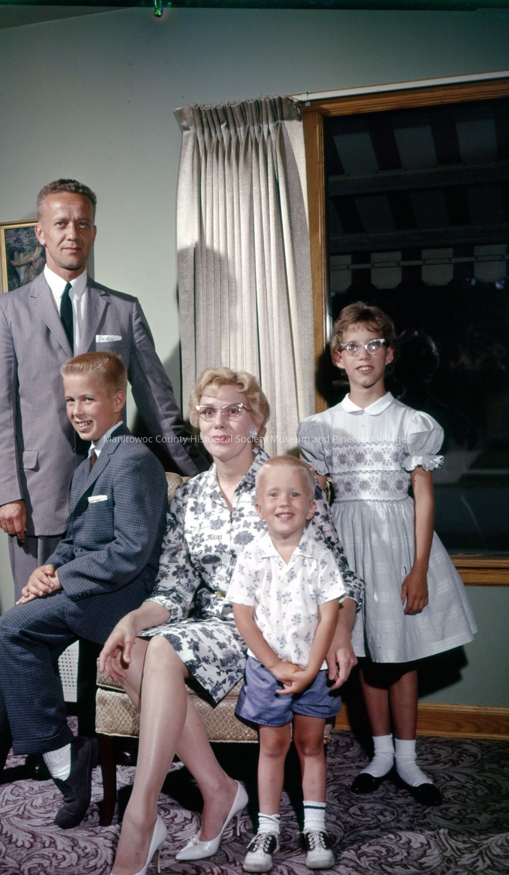 First Reformed Church of Christ, 3613 Waldo Blvd. Manitowoc; Pastor Ted Crusius with wife Anna and children. Photograph taken on June 26th, 1962.Made/Created