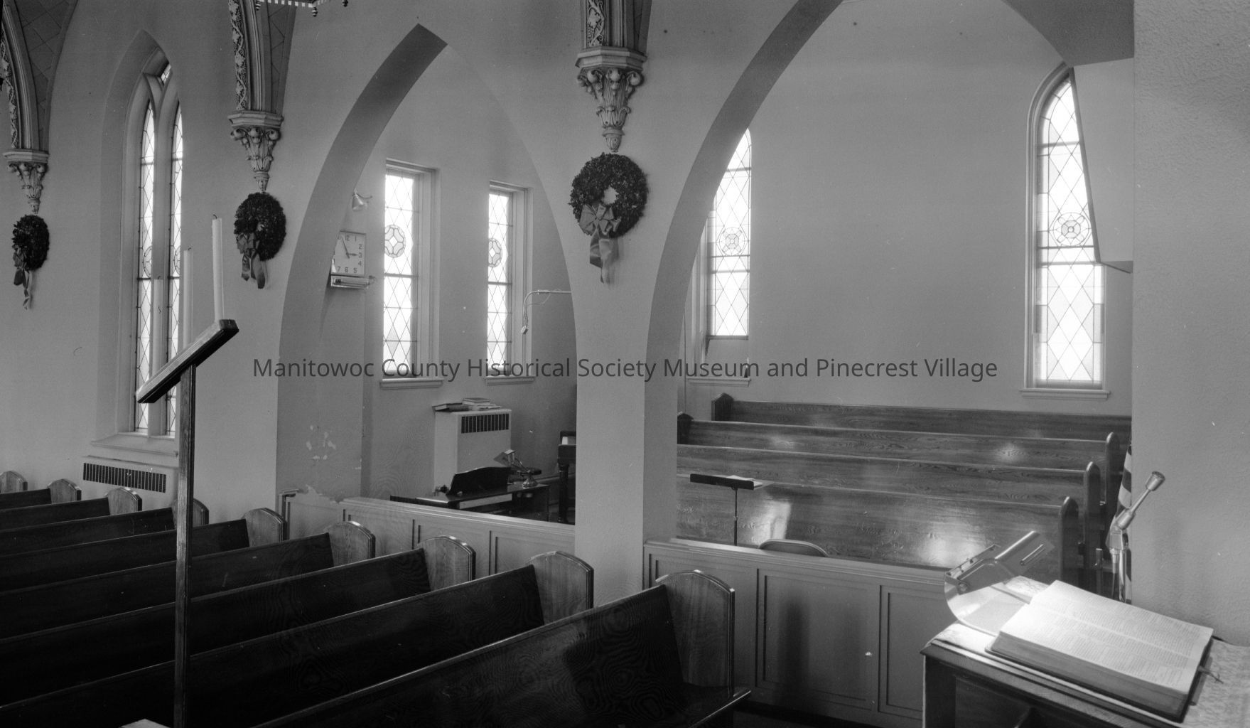 First Reformed Church of Christ, 1009 South 9th Street Manitowoc; side chapel & pulpit. Photograph taken on December 27th, 1961.Made/Created