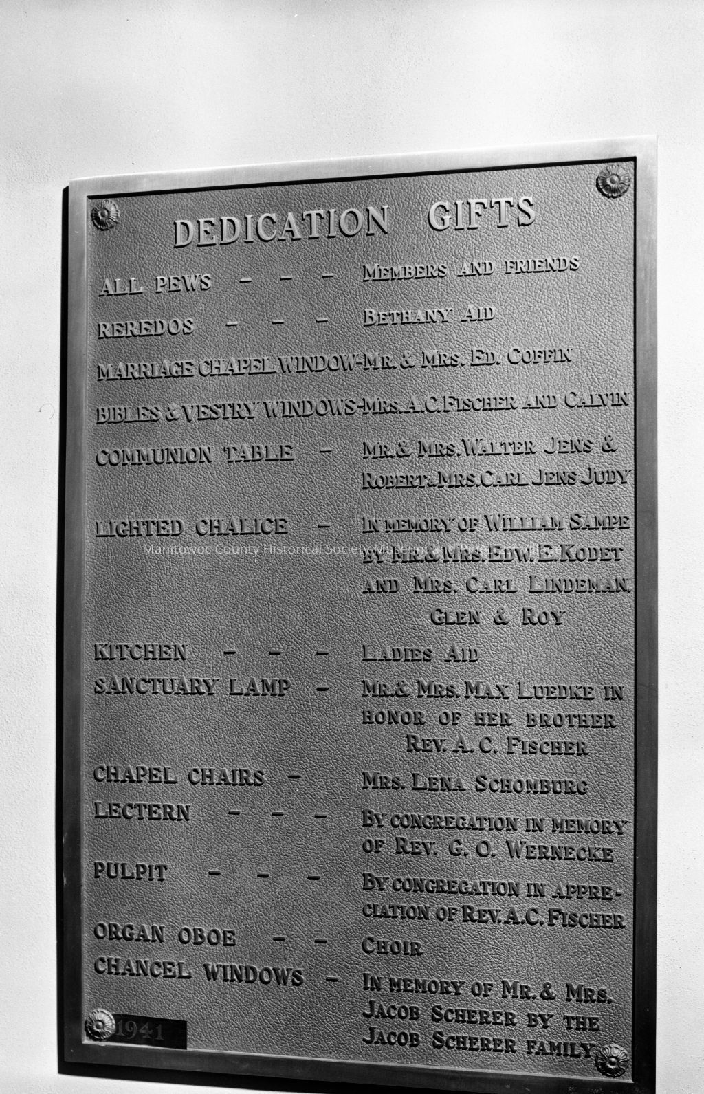 First Reformed Church of Christ, 1009 South 9th Street Manitowoc; plaque for dedication gifts. Photograph taken on December 27th, 1961.Made/Created