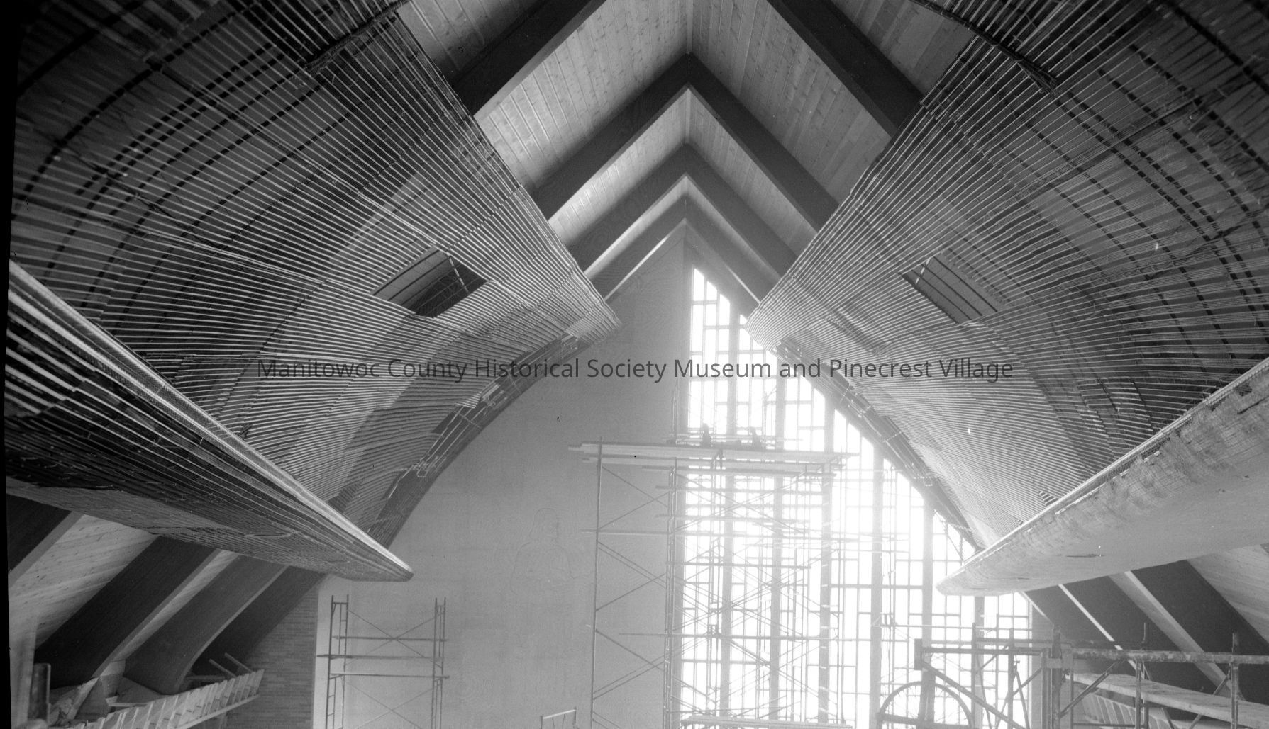 First Reformed Church of Christ, 3613 Waldo Blvd. Manitowoc; interior chapel work looking toward front of church. Photograph taken on April 29th, 1962.Made/Created