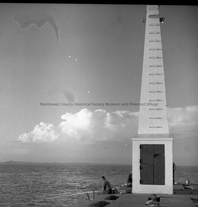 Fishing at end of southside pier in Manitowoc by the lighthouse. Photograph taken in 1955.