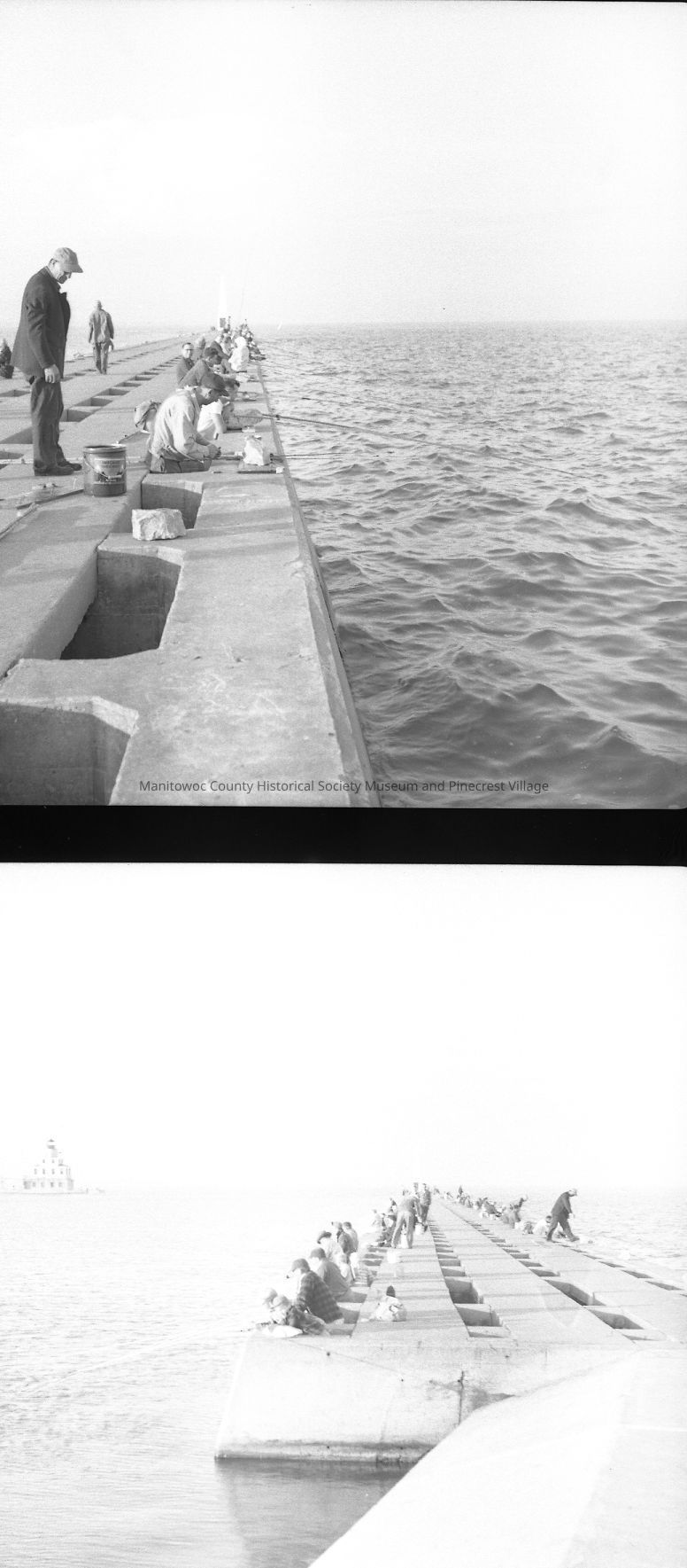 Fishing on southside pier Manitowoc. At left is the northside pier lighthouse with more fishermen. Circa 1955.Made/Created