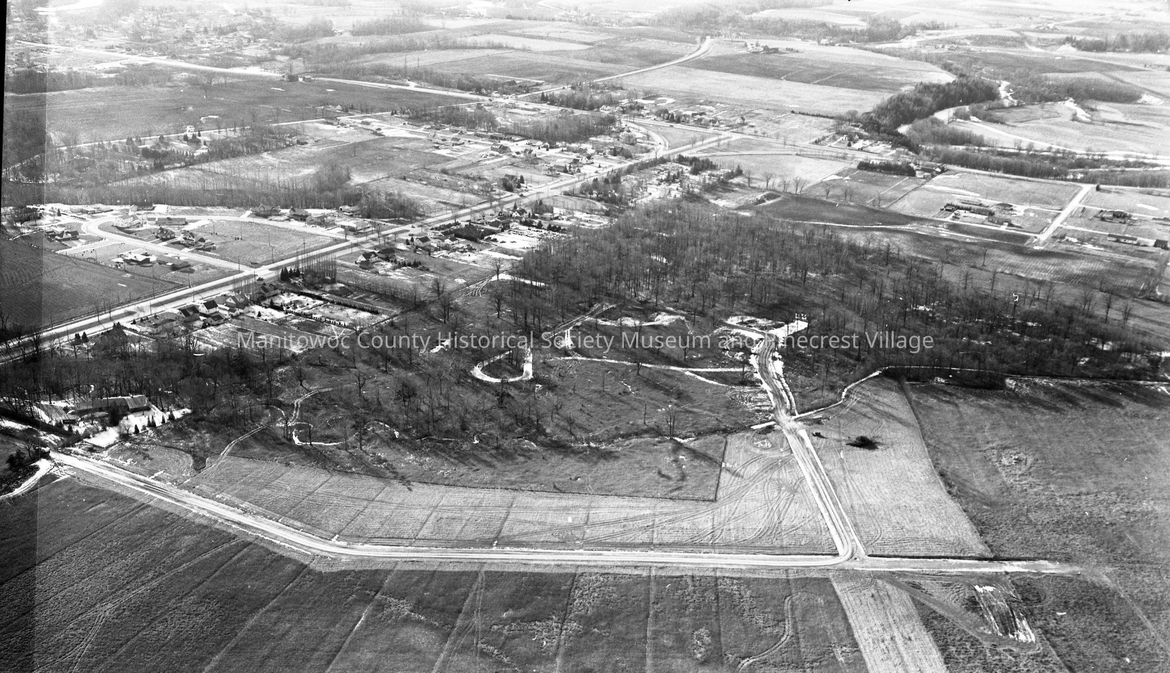 Aerial of Fleetwood Drive at Wildwood Drive Manitowoc. Waldo Blvd is at angle at left; rail line at bottom is C&NW mainline to Green Bay. Photograph taken on December 12th, 1960.Made/Created