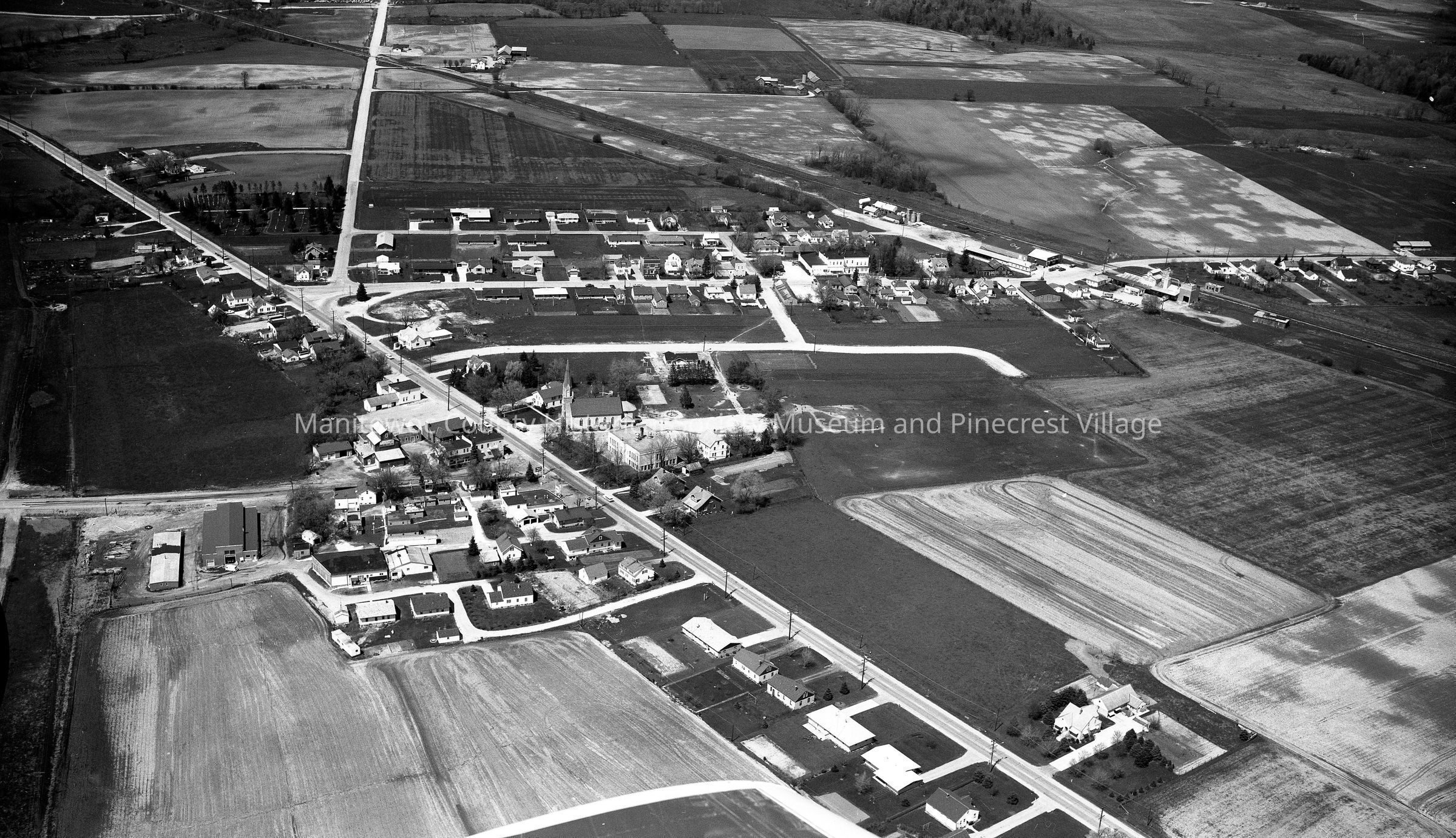 Aerial of Francis Creek looking north. At St. Anne Cathlic church and school are center. Photograph taken in 1965.