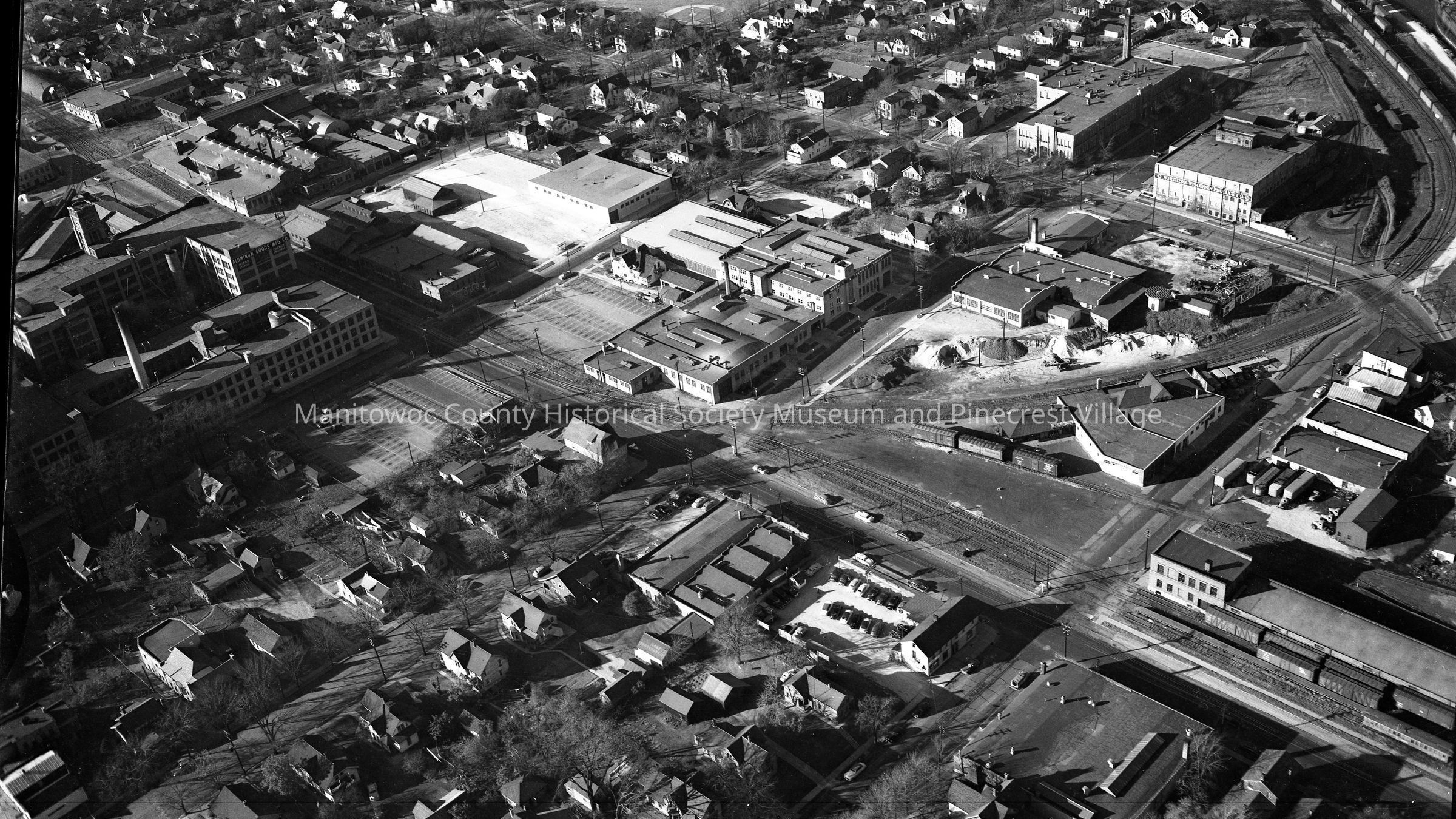 Aerial view of Franklin Street at South 13, 14 & 15th street Manitowoc. Center is Heresite Chemical Company, 822 South 14th and across is old Manitowoc City Shops, 803 South 14th. Northern Wisconsin Produce Cold Storage, 1306 and Manitowoc Vocational School, 1402 Clark street. Bottom right is C&NW RR freighthouse at South 13th & Franklin Street. At top is Westfield ball diamond on Wollmer Street. Photograph taken in 1953.Made/Created