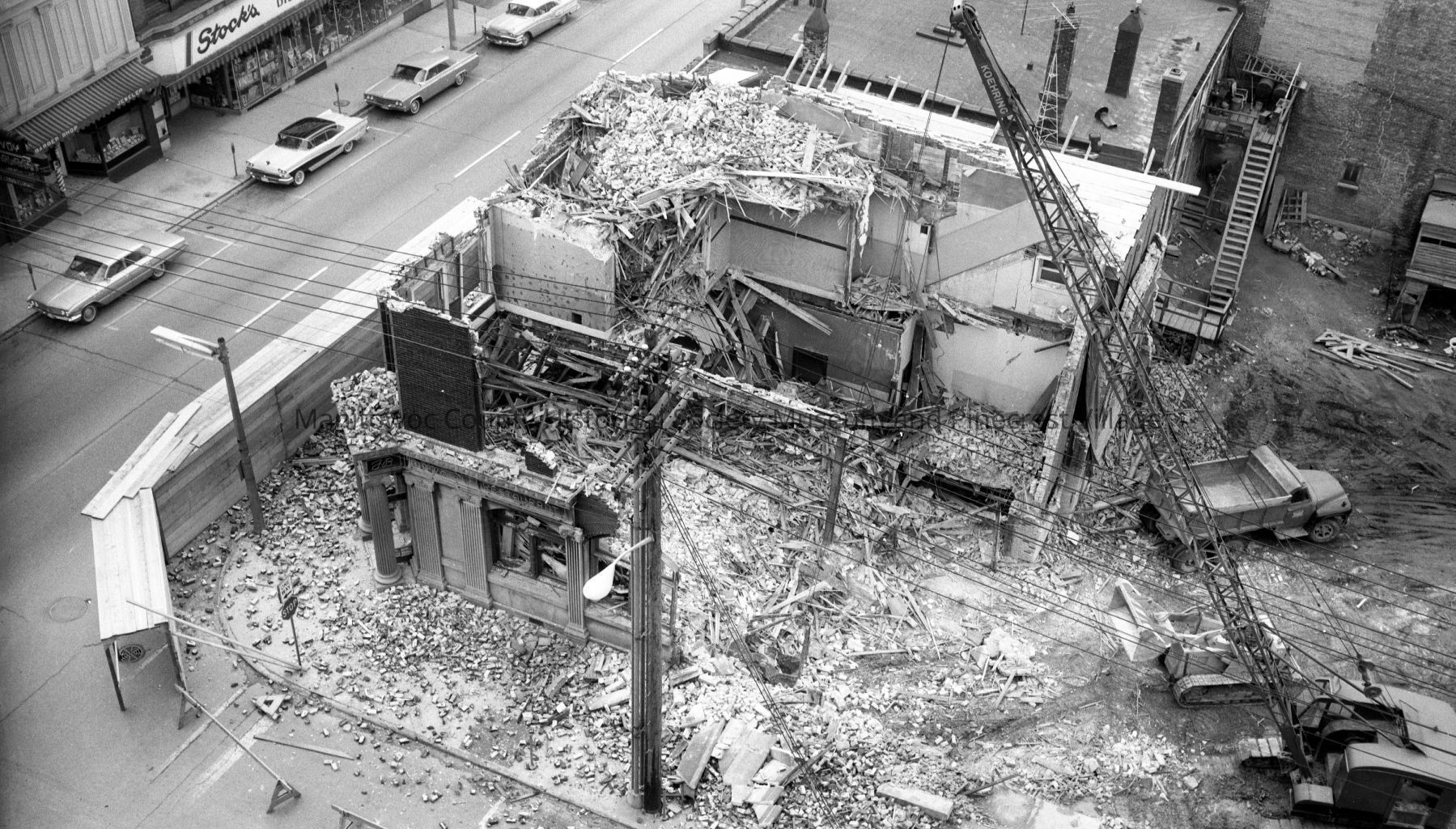 Birds-eye from Hotel Manitowoc of the tearing down of Freddy Brick's Restaurant, 118 North 8th Street Manitowoc to make room for new loan office and drive-thru First National Bank. At upper left is A&T Barbershop and Wiliamson Jewelry, 113; and Stock's Consumers Discount Store, 109 North 8th Street. Photograph taken in May 1963.Made/Created
