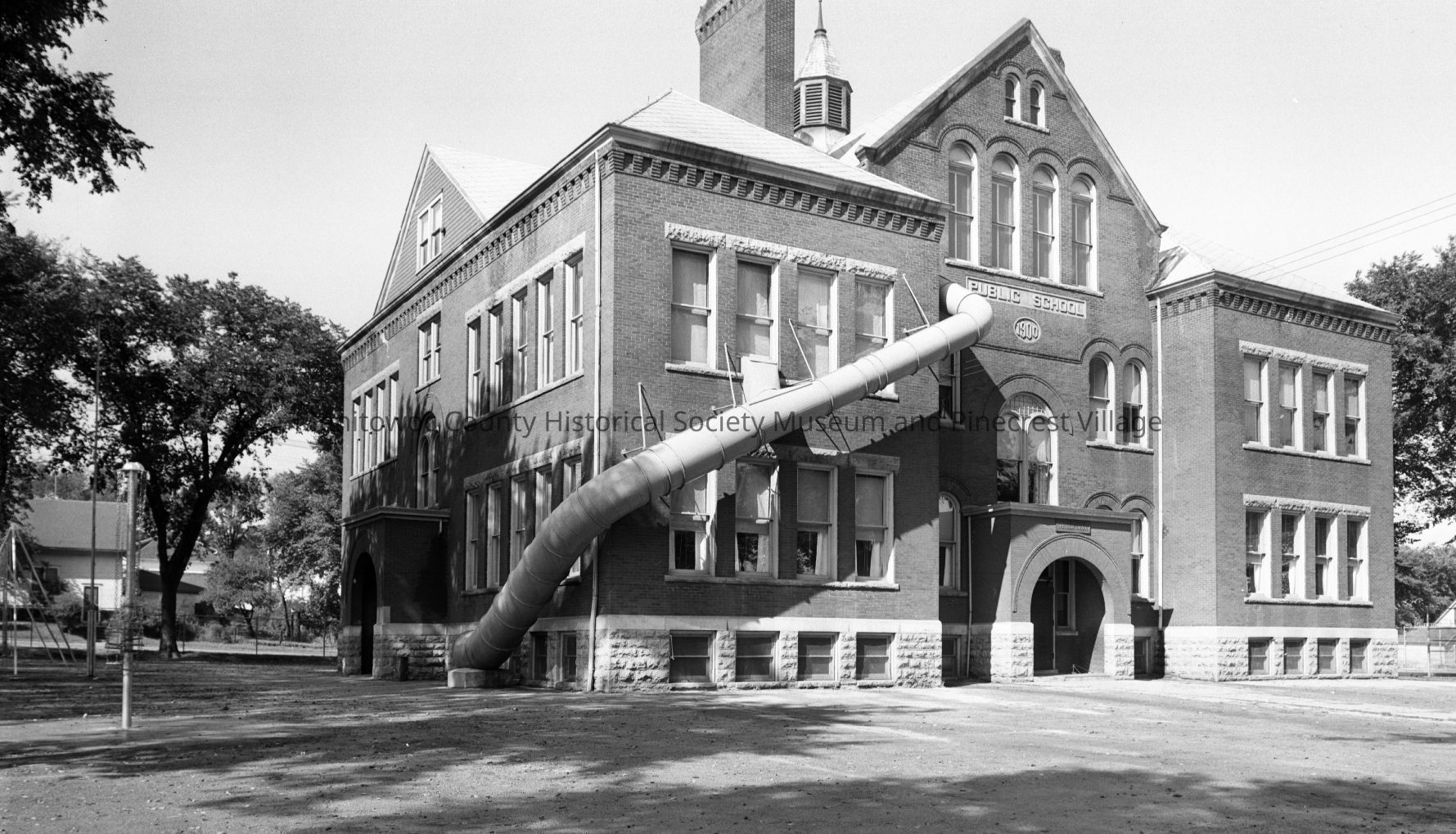 School - Garfield, 2002 Clark Street Manitowoc. Notice fire escape tubes. Photograph taken in 1958.