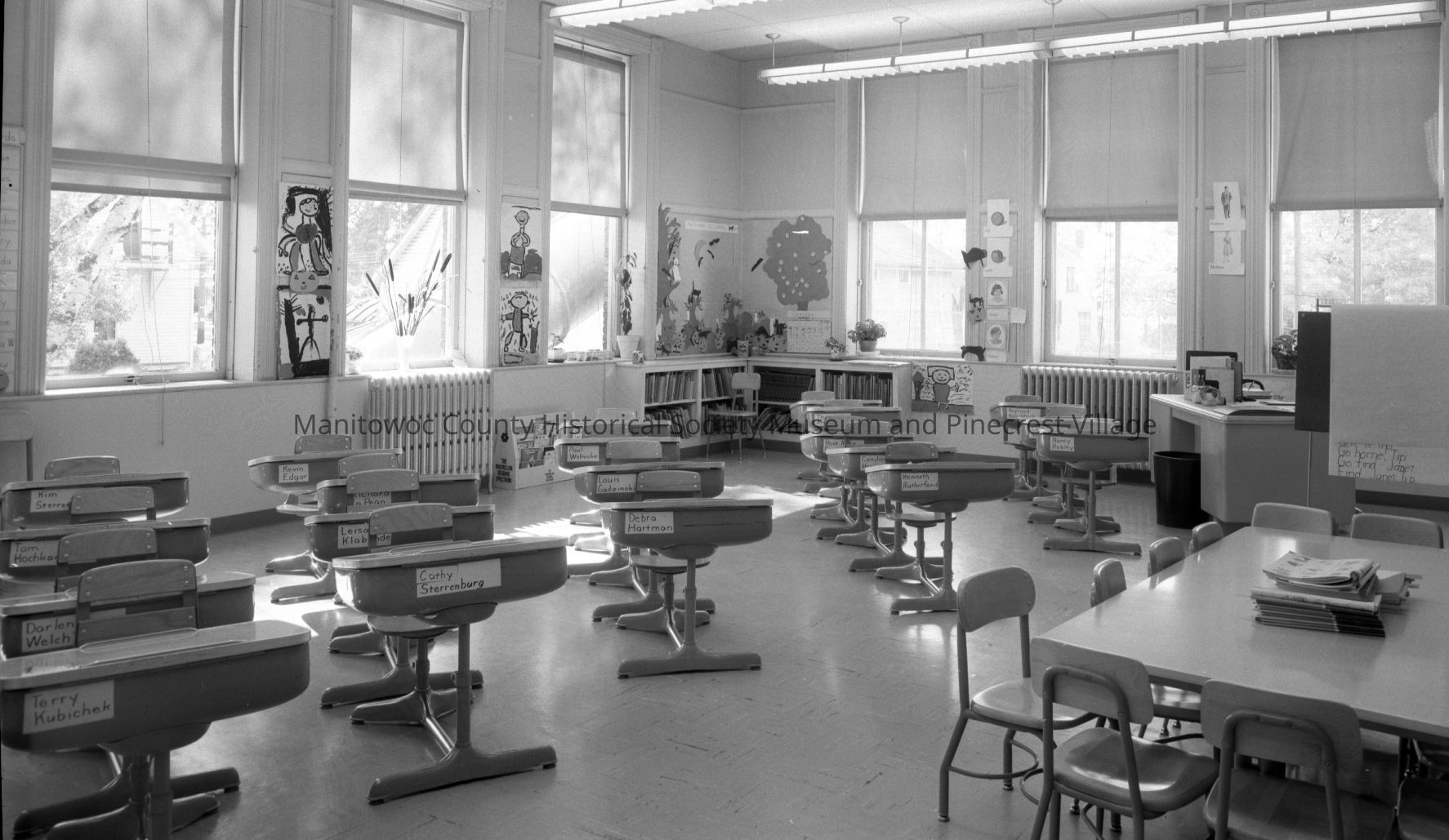 School - Garfield, 2002 Clark Street Manitowoc; class room with student names on desks. Photograph taken in October 1965.Made/Created