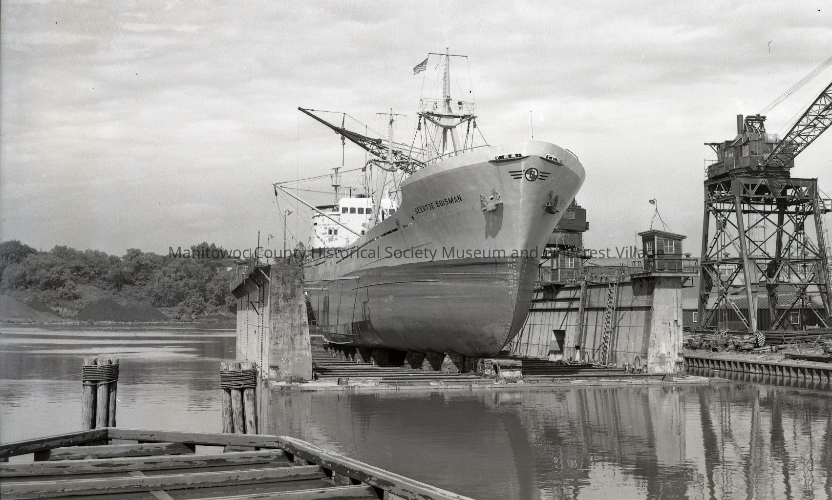 Foreign ship Geertje Buisman in dry dock at Manitowoc Shipbuilding. Railyard cranes were coal fired and steam drivenMade/Created