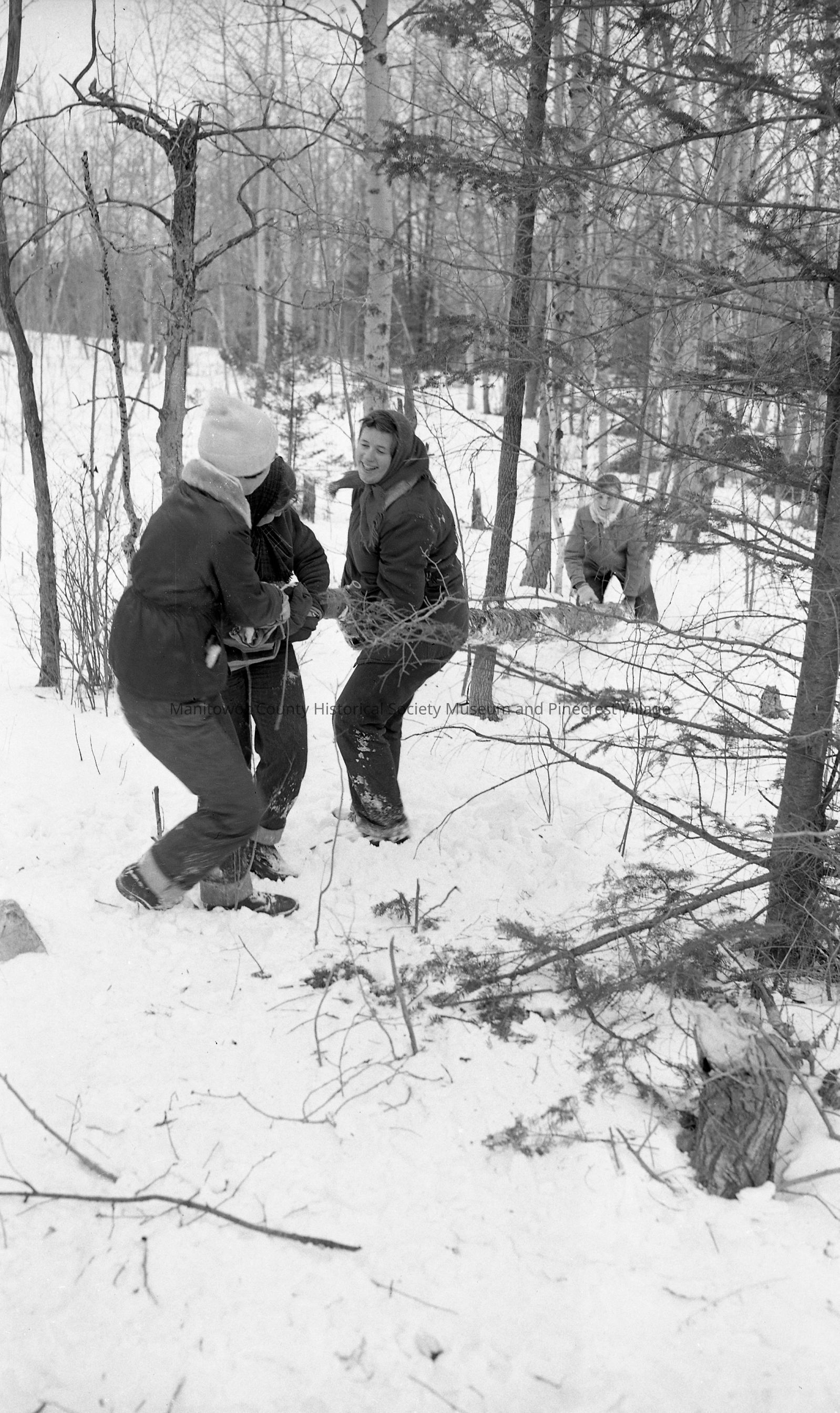Girl Scouts: carrying log out of woods at Camp Manitou, Shoto. Photograph taken on March 9, 1953 by Daryl Cornick.