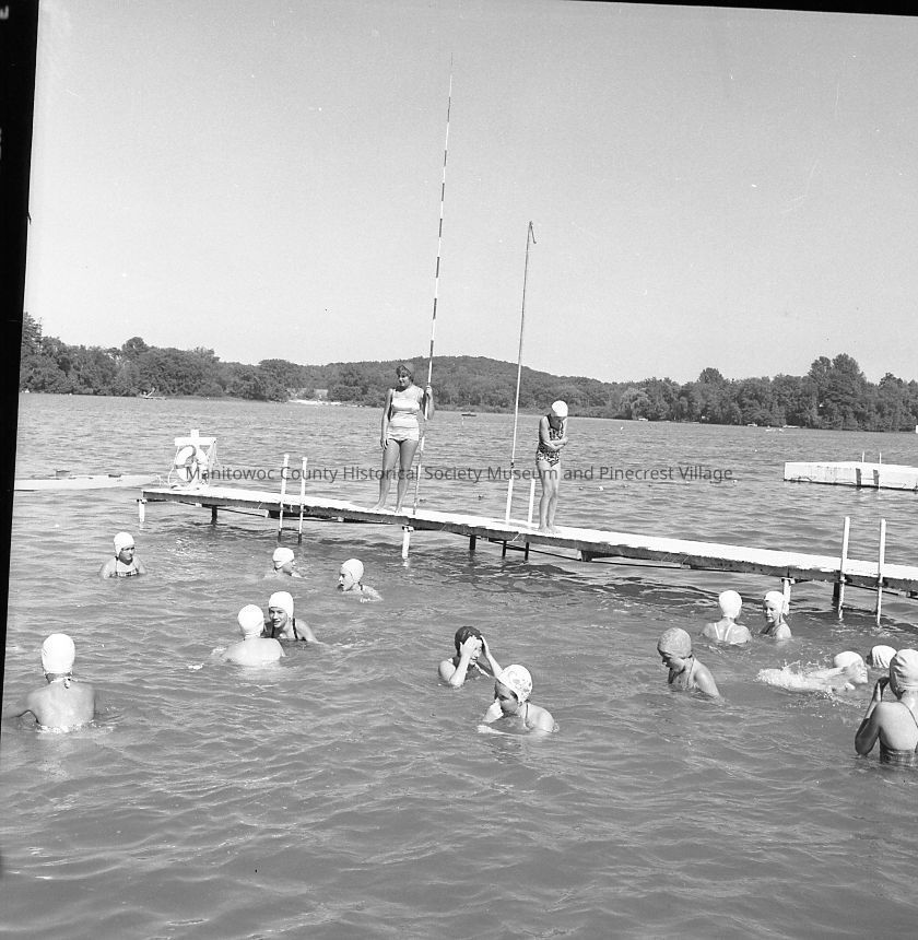 Girl Scouts swimming in Pigeon Lake at Camp Sinawa.