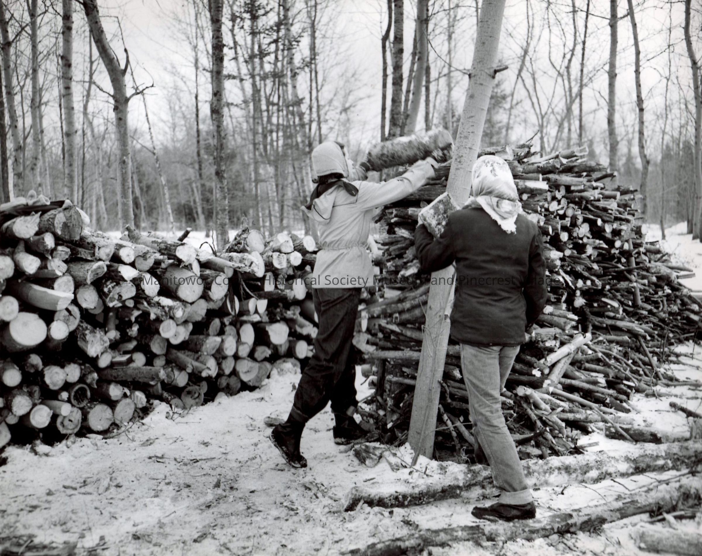 Black and white photo of Girl Scouts and Lleaders at Camp Manitou, Shoto chopping and stacking wood.Made/Created