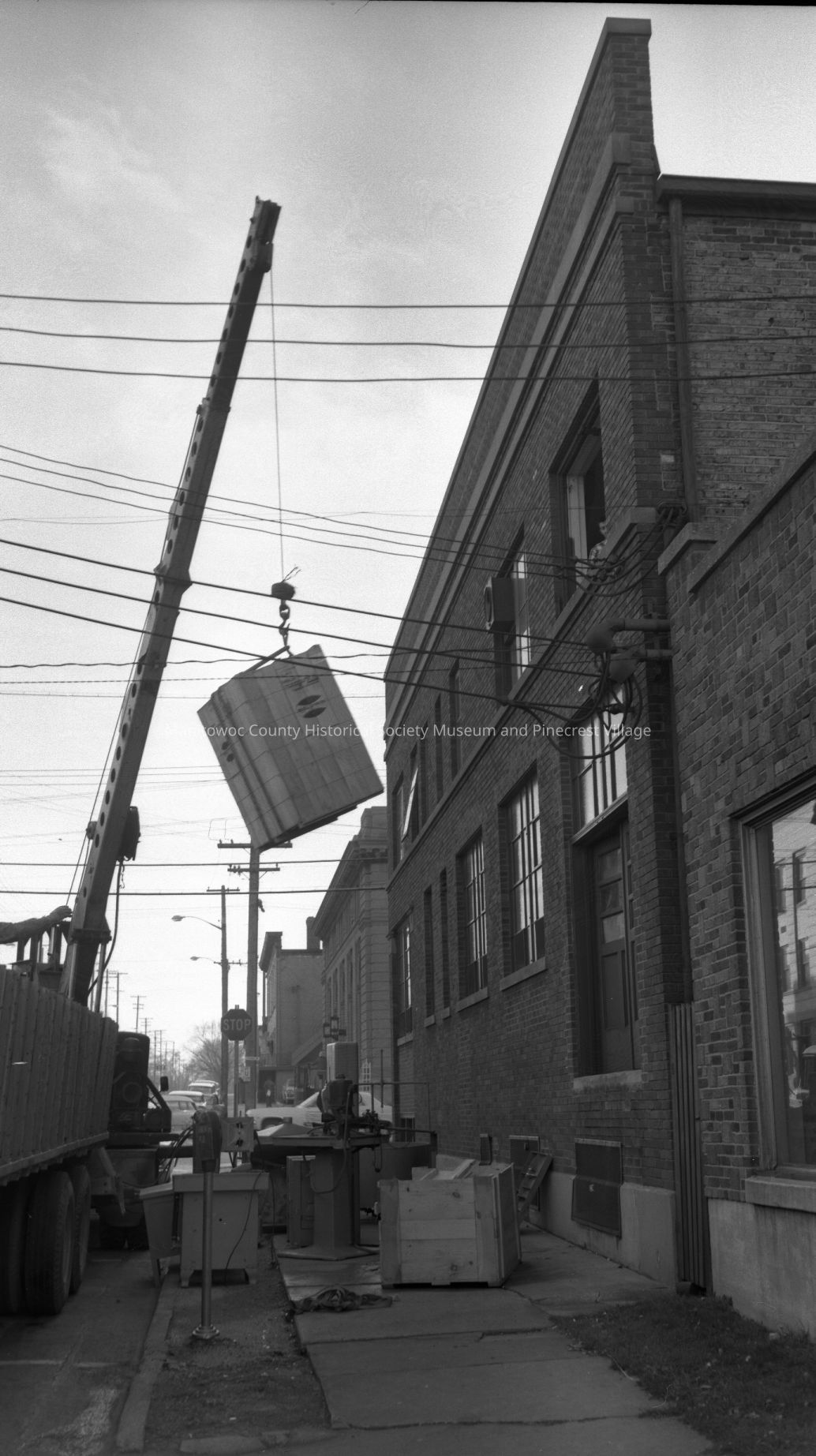 Herald Times newspaper getting new camera equipment loaded into the second story window on the 9th Street side of building. Photograph taken in 1965.Made/Created