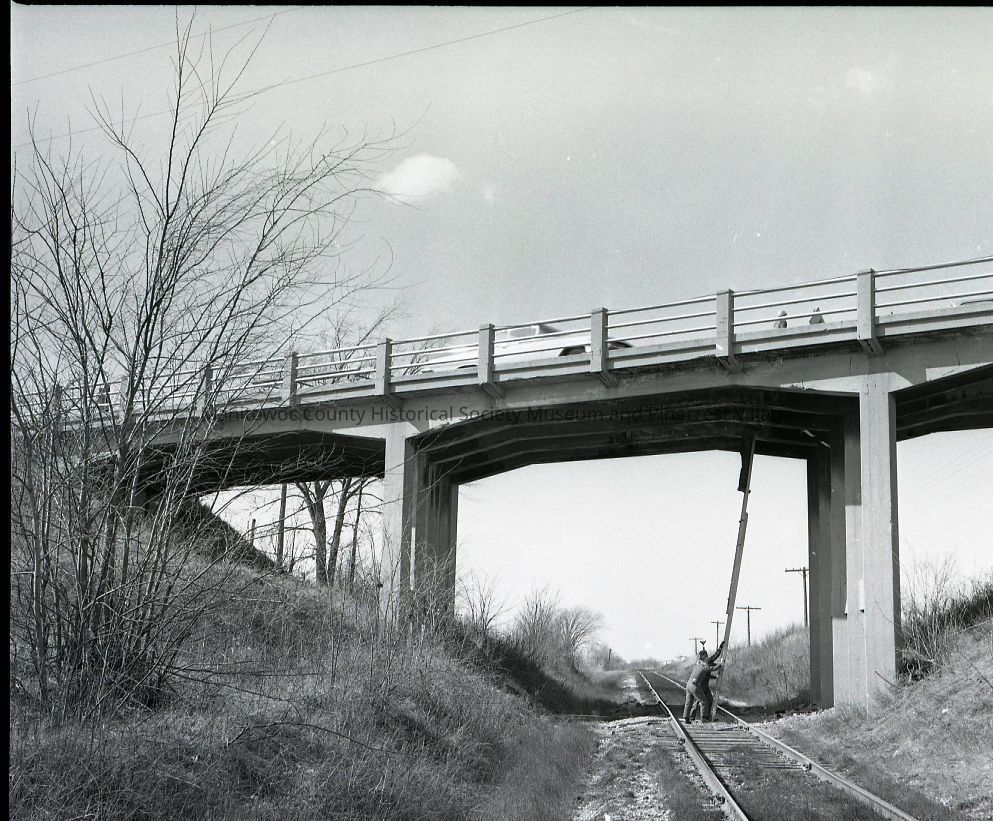 Highway bridge on old 141 north of Manitowoc near old highway 10 intersection. Section of roadway fell out and men trying to repair with support from below. Rail line is old C&NW RR to Branch and beyond. Photograph taken on March 26th, 1968.Made/Created