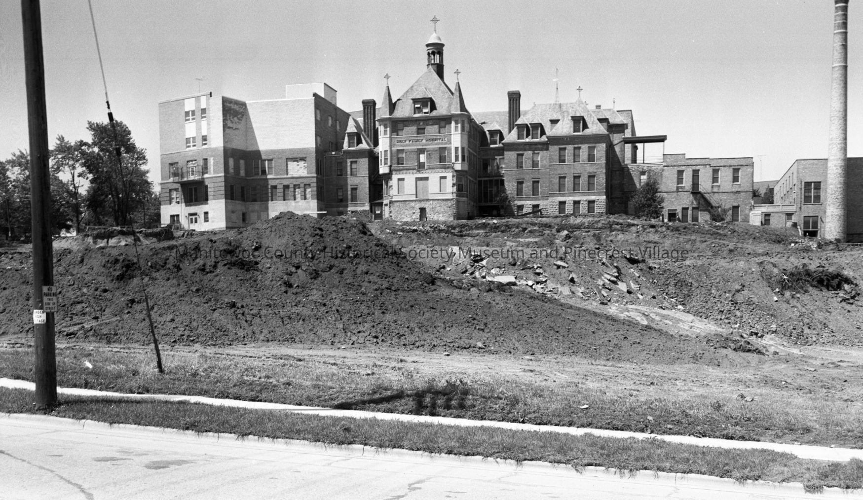 Preparing land for the new east wing Holy Family Hospital 2300 Western Ave. Manitowoc, looking from South 21st Street. Photograph taken on July 25th, 1964.Made/Created