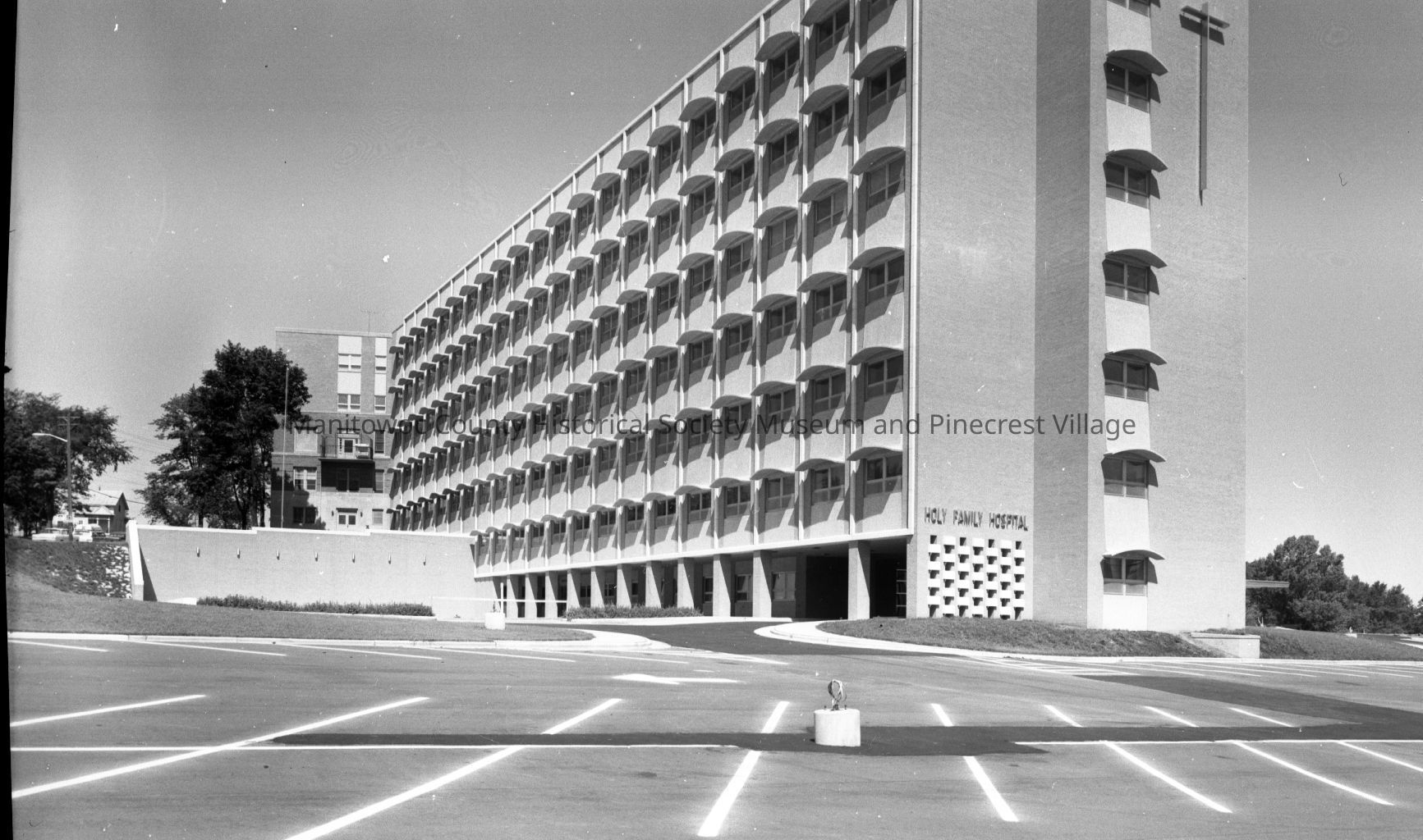 Finished southside of new east wing of Holy Family Hospital looking from lower parking lot at South 21st Street. Photograph taken in July 1966.Made/Created
