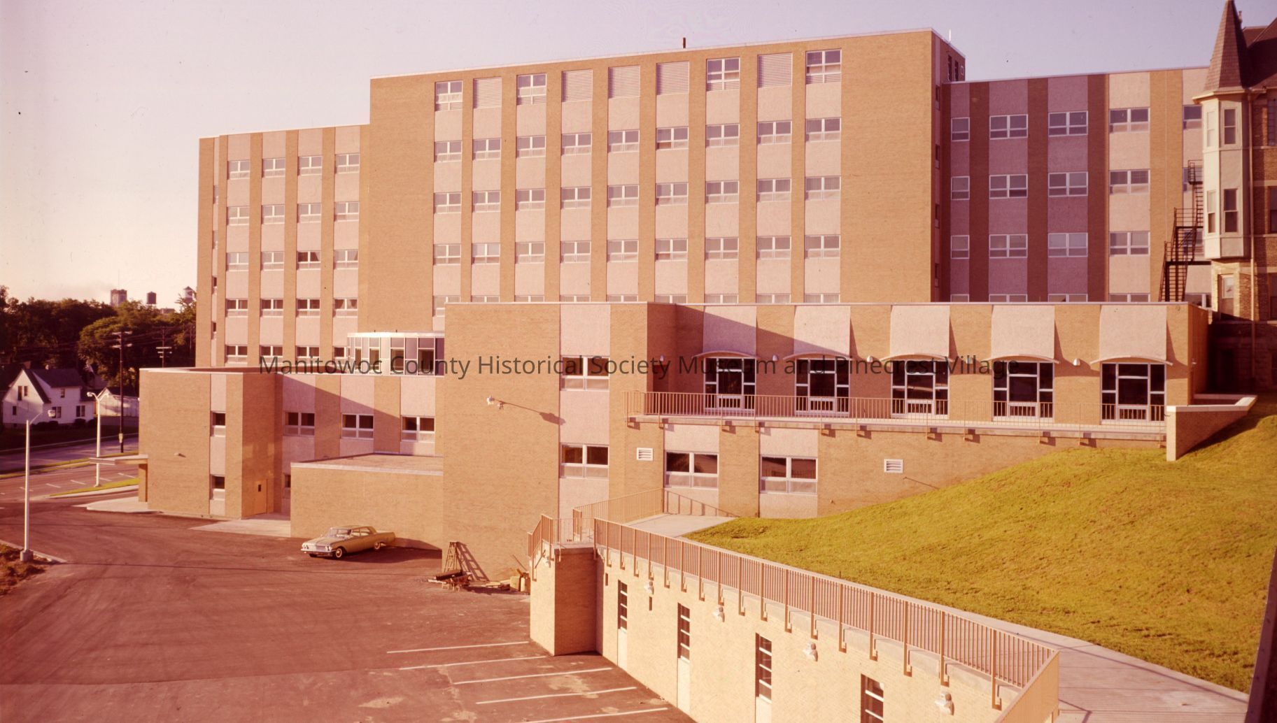 North side of new east wing of Holy Family Hospital. Section of old hospital at right. Photograph taken in August 1966.Made/Created