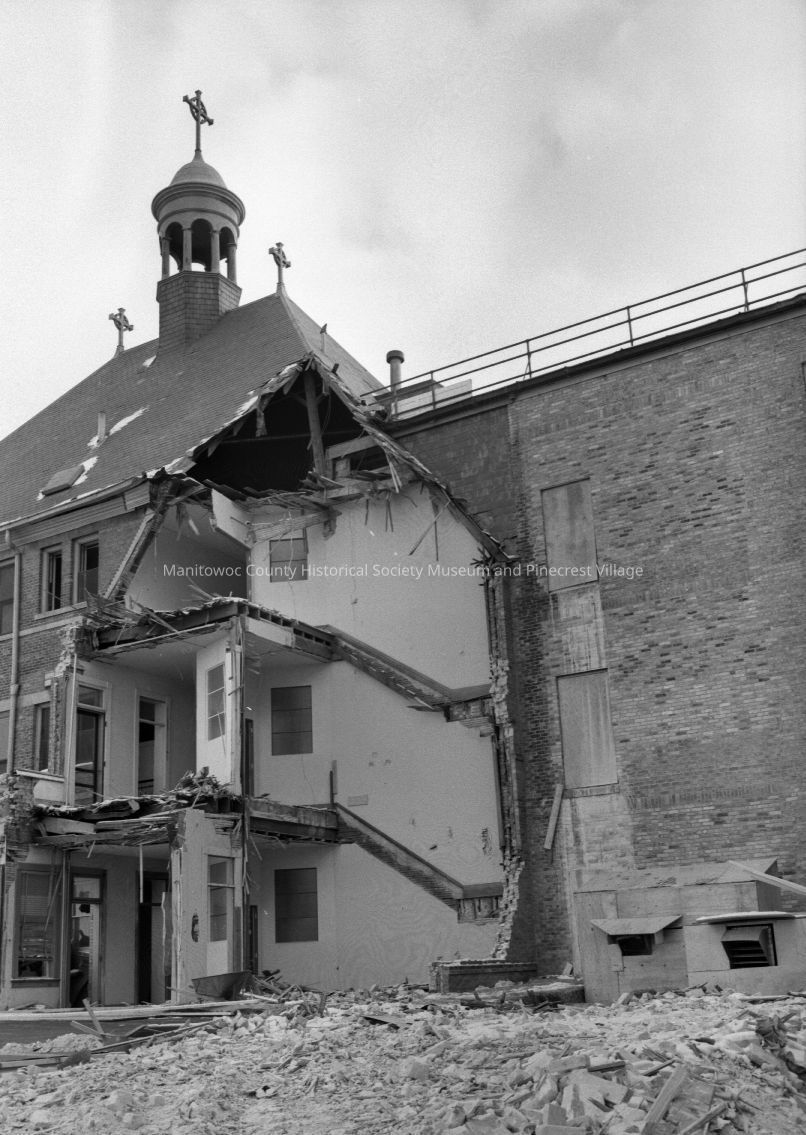 Old section of Holy Family Hospital, Manitowoc being demolished. Photograph taken on February 10th, 1973.