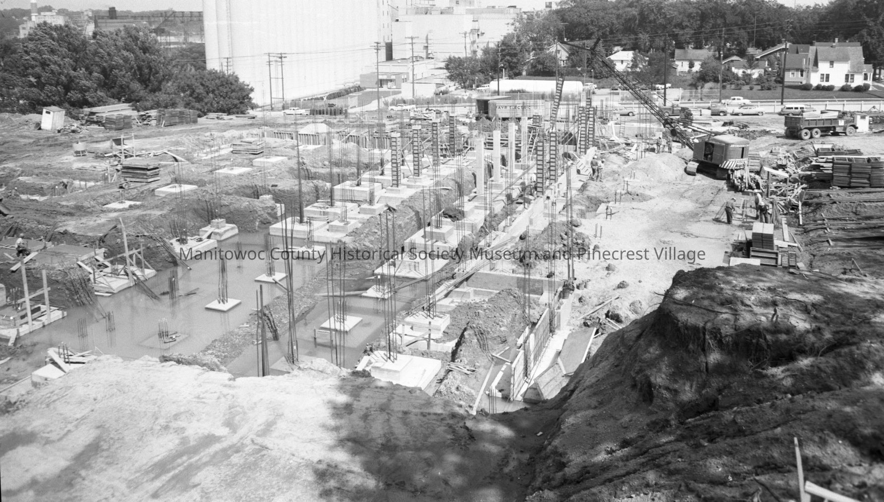 Foundation for the new east wing being laid at Holy Family Hospital 2300 Western Ave. in Manitowoc. At right is intersection of South 21st & Wollmer Street and upper left is Wisconsin Malting on South 21st Street. Photograph taken on August 24th, 1964.Made/Created