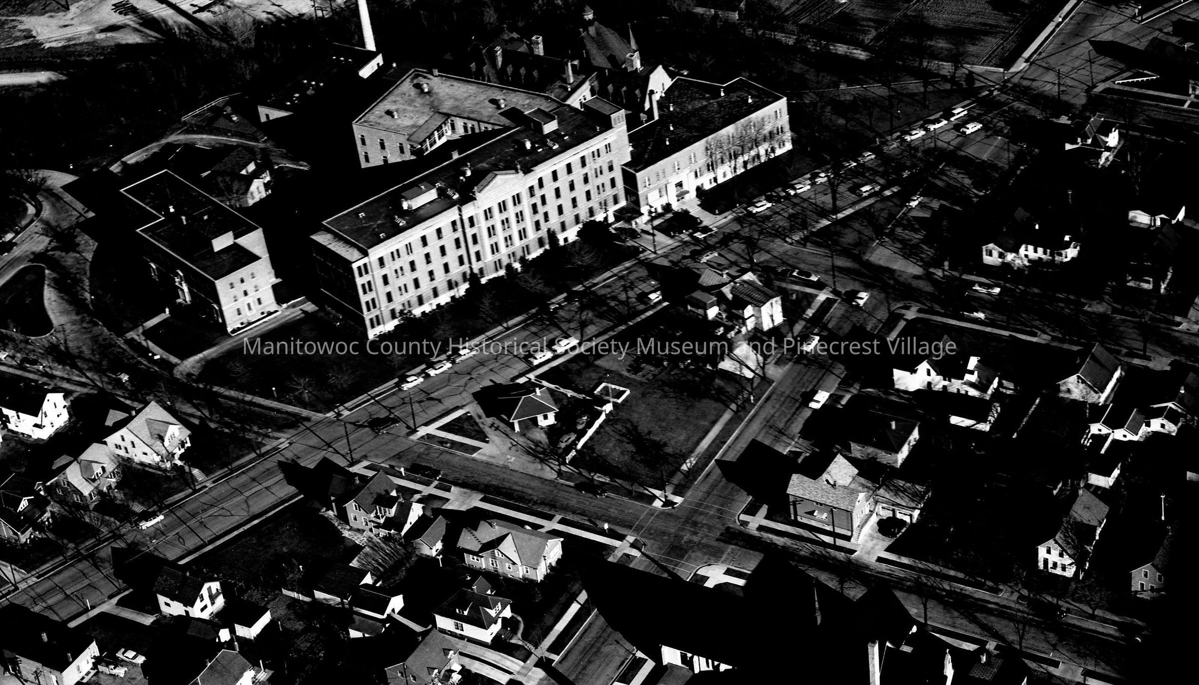 Aerial of Holy Family Hospital, 2300 Western Ave. At bottom is St Paul Catholic Church and school, 2411 Wollmer Street. Photograph taken on November 17th, 1958.Made/Created