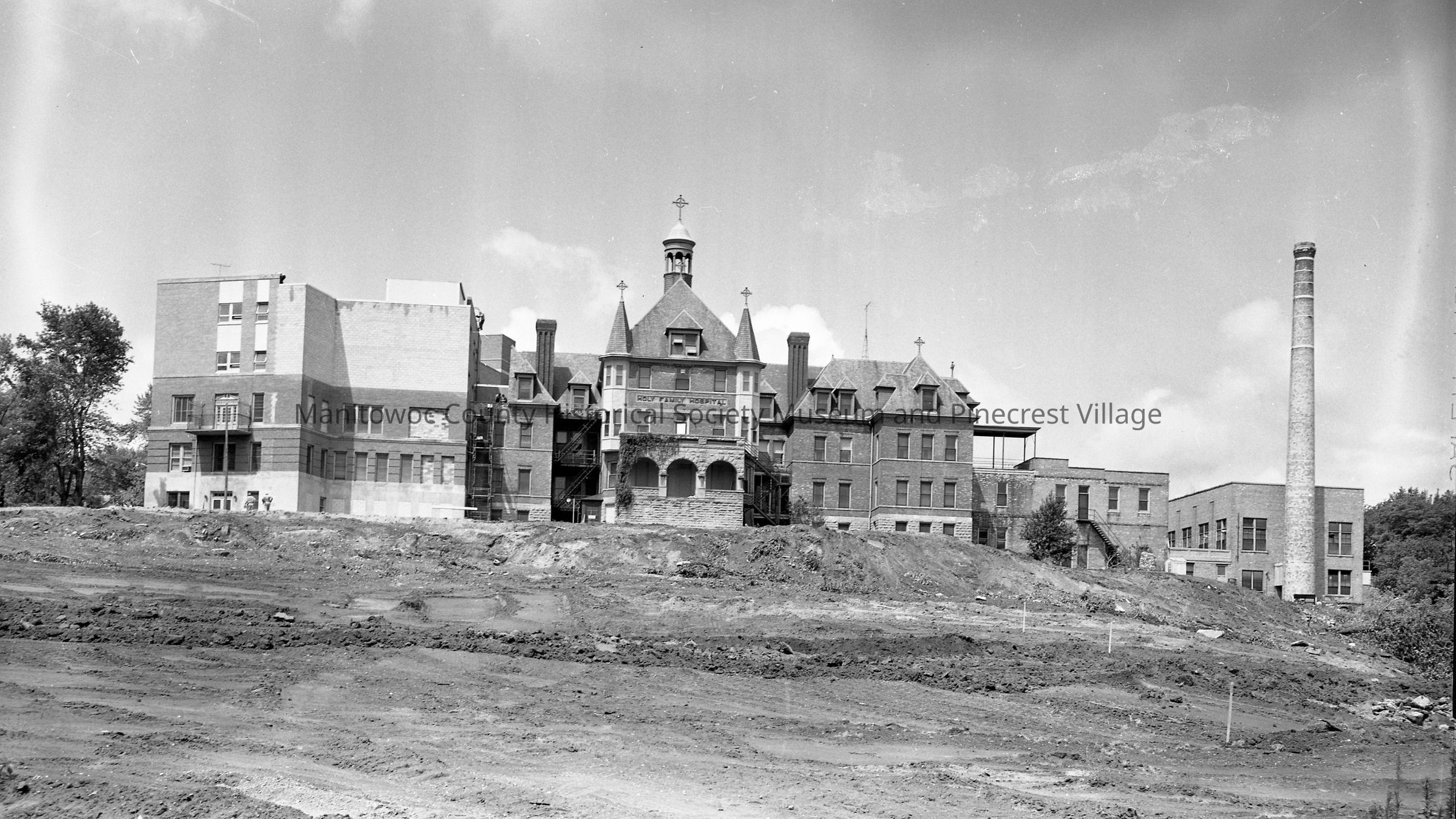Holy Family Hospital: looking at east end of old building. Land in front will be where new wing will go.