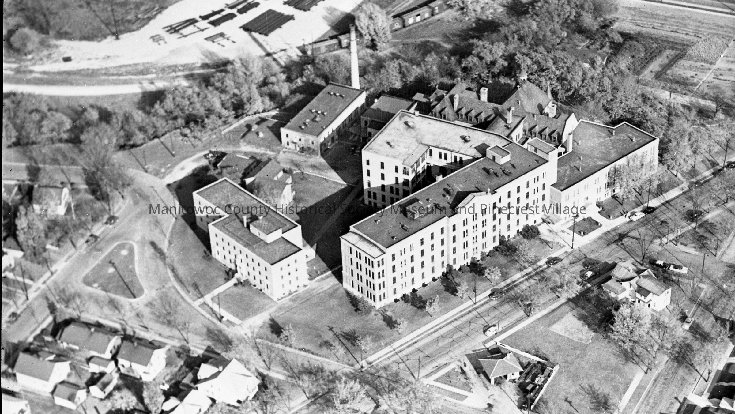 Aerial: Holy Family Hospital, 2300 Western Ave Manitowoc. At lower right intersection of Western Ave and South 24th Street is Krainik's Dixie Service Station, 2315 Western Ave