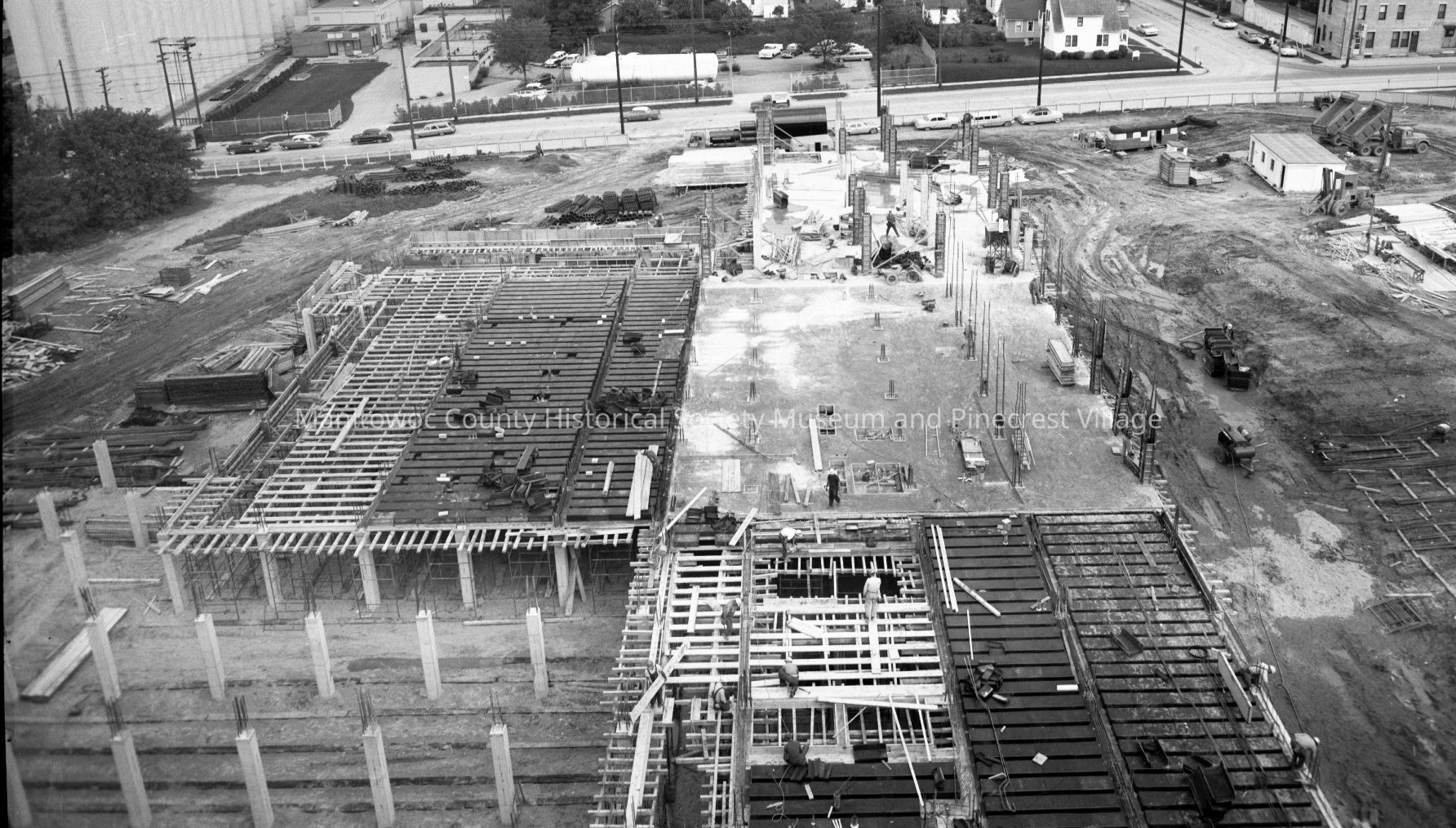 New east wing in process at Holy Family Hospital 2300 Western Ave. Manitowoc. At right is the intersection of South 21st & Wollmer Street and Endries Bar. At upper left is Wisconsin Malting. In distance is Manitowoc County courthouse and Rahr Malting. Photograph taken on September 24th, 1964.Made/Created