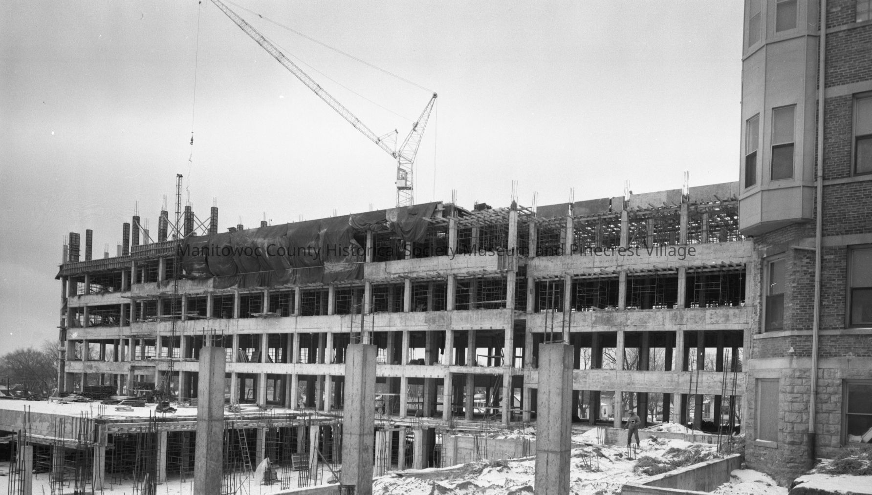 Looking at north side of new east wing of Holy Family Hospital. Part of original old hospital at right. Photograph taken on December 27th, 1964.Made/Created