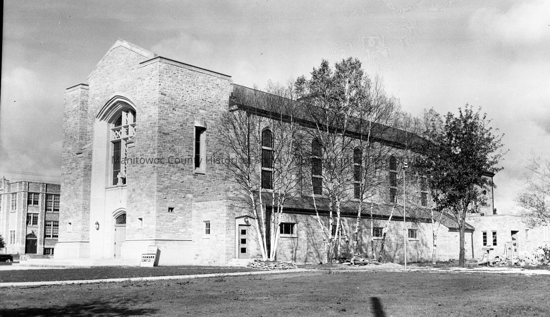 Holy Innocent Catholic church, 1408 Waldo Blvd Manitowoc; at left is Christian Day School. Photograph taken on October 20th, 1951.Made/Created