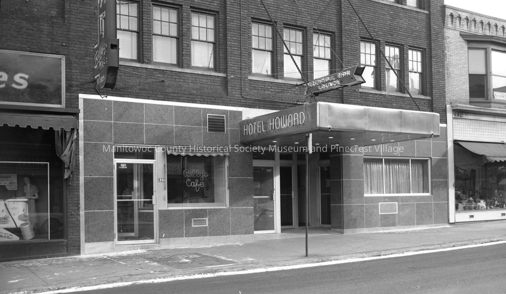 Hotel Howard, 825 South 8th Street Manitowoc. Door at left was to Billy's Cafe. At right is the Book & Gift shop, 831 South 8th Street. Photograph taken on January 18th, 1954.Made/Created