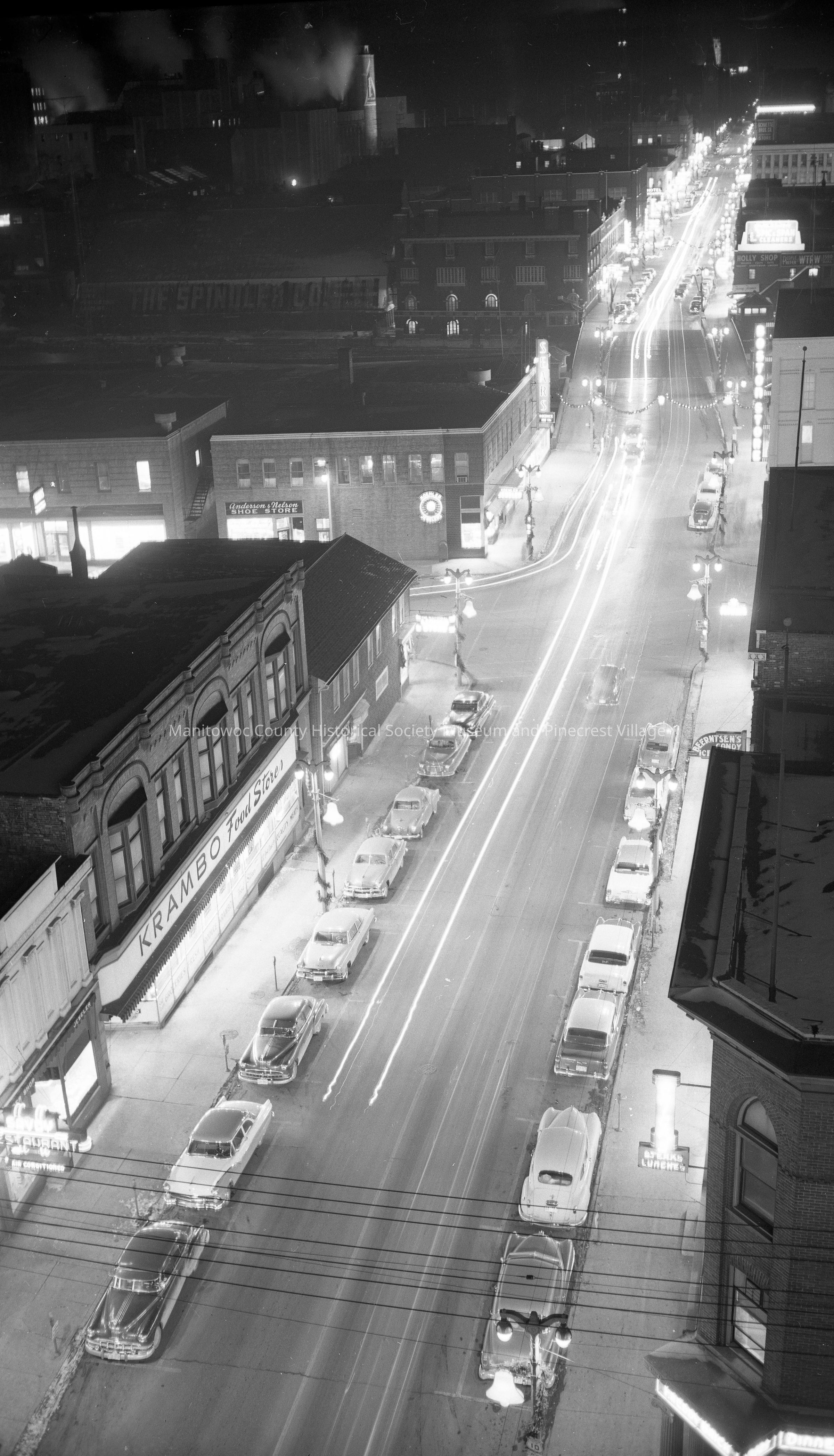 Birdseye from Hotel Manitowoc looking south at intersection of North 8th & Commercial Street Manitowoc. Left is Krambo Food Store, 109 and at lower right corner is Freddy Brick's Restaurant, 118 North 8th. At corner of North 8th & Commercial is Sears Roebuck store, 1 and Koehler Jewelry store, 13 North 8th street. This is a night photo. Photograph taken on December 20th, 1955.Made/Created