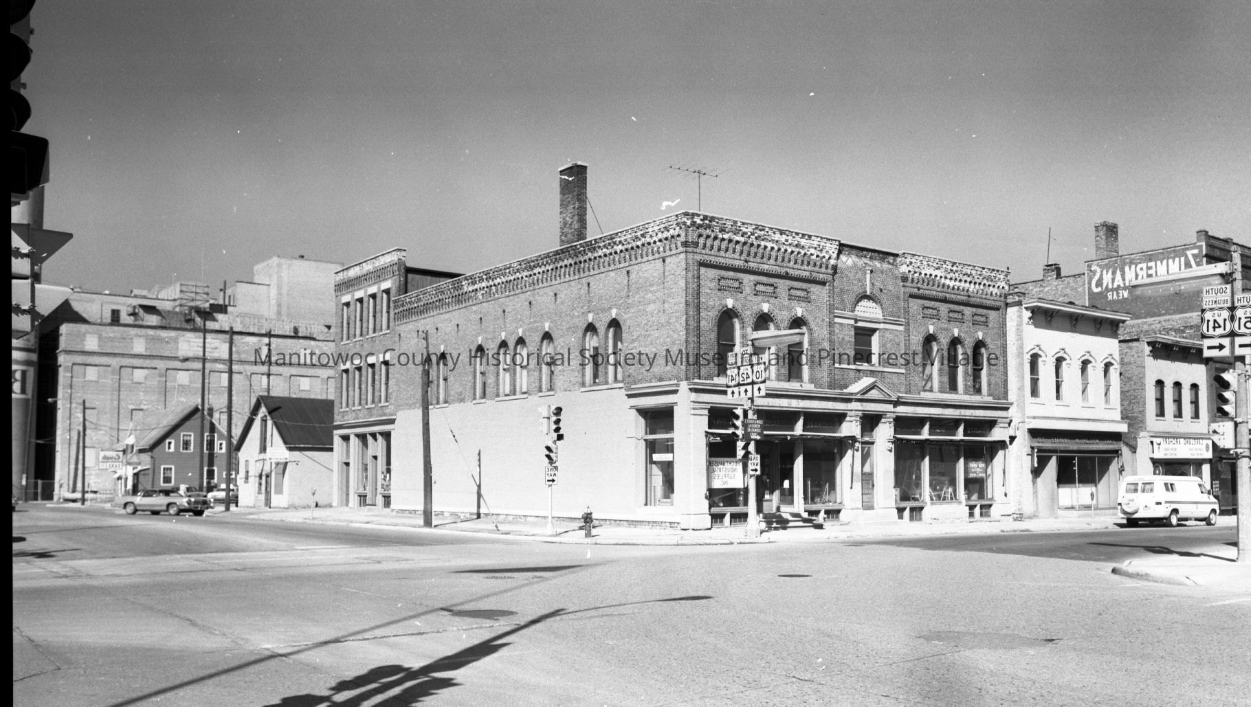 Huchthausen Hardware, 939 South 8th Street Manitowoc. At right is Anheuser-Busch and Manitowoc Cab Company, 704 Washington Street. At left is East Wisconsin Trustee, 935 South 8th and Lakeland Archery, 833 South 8th Street. Photograpn taken on April 23rd, 1977.Made/Created