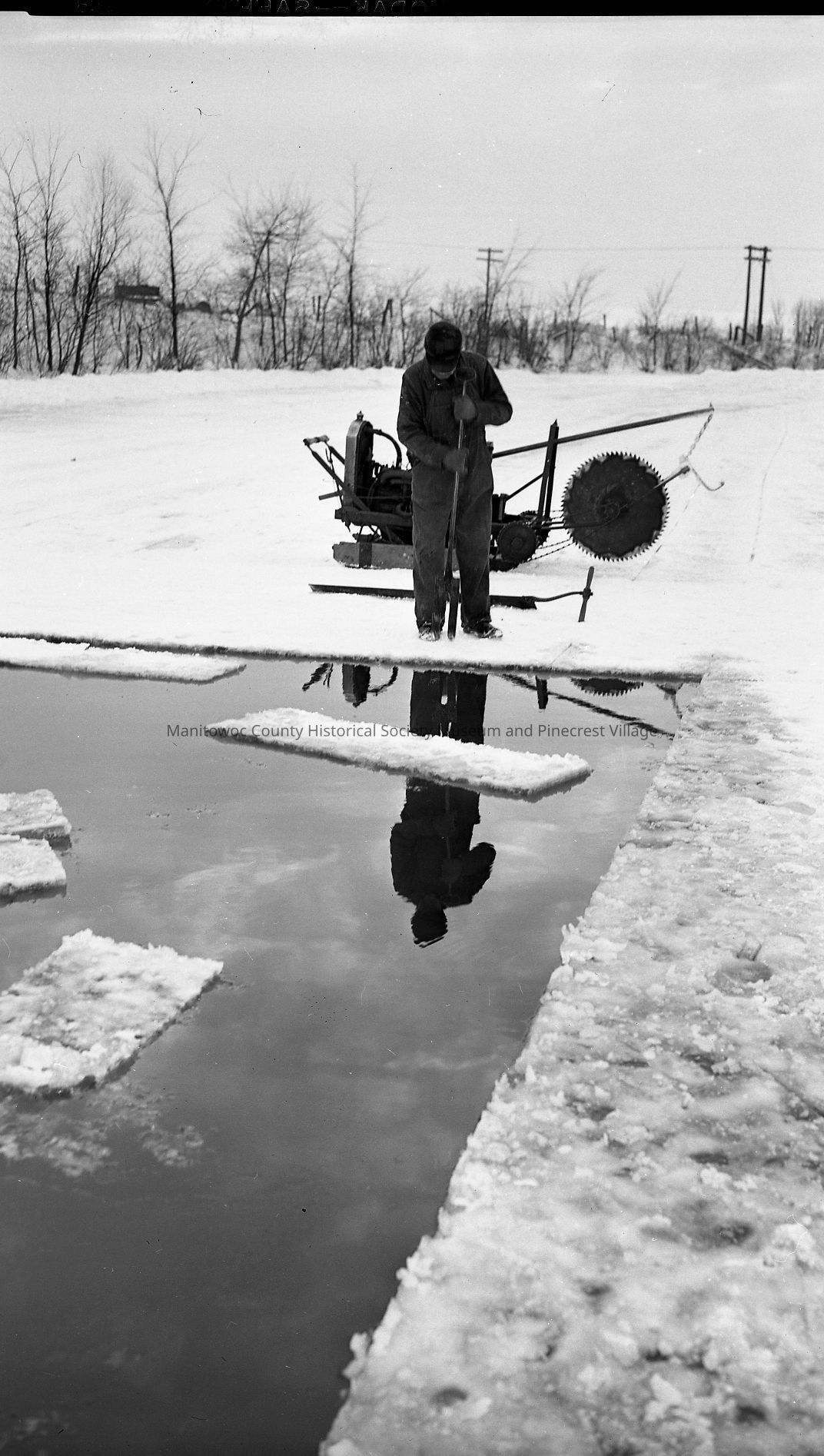 Mishicot; prying a block of ice free during ice harvest. Photograph taken on January 19th, 1953.