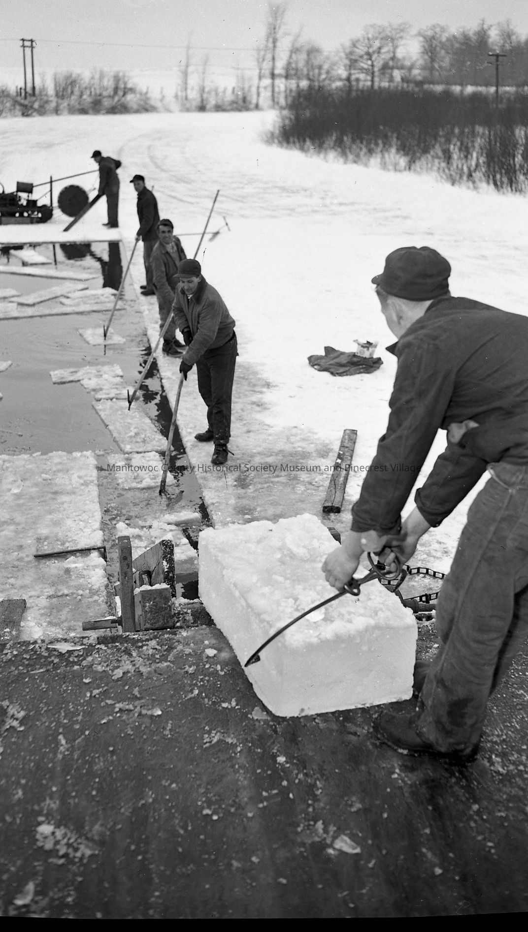 Mishicot; pulling blocks of ice ashore. Photograph taken on January 19th, 1953.