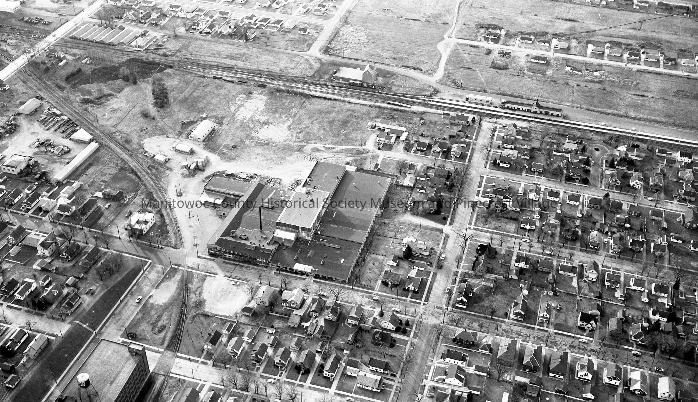 Aerial of Invincible Metal Furniture, 842 South 26st Street. At bottom left is Mirro Aluminum plant #3, 2402 Franklin and near top is Oriental Milling Company, 835 South 29th and to right is the C&NW RR depot. Circa 1955.Made/Created