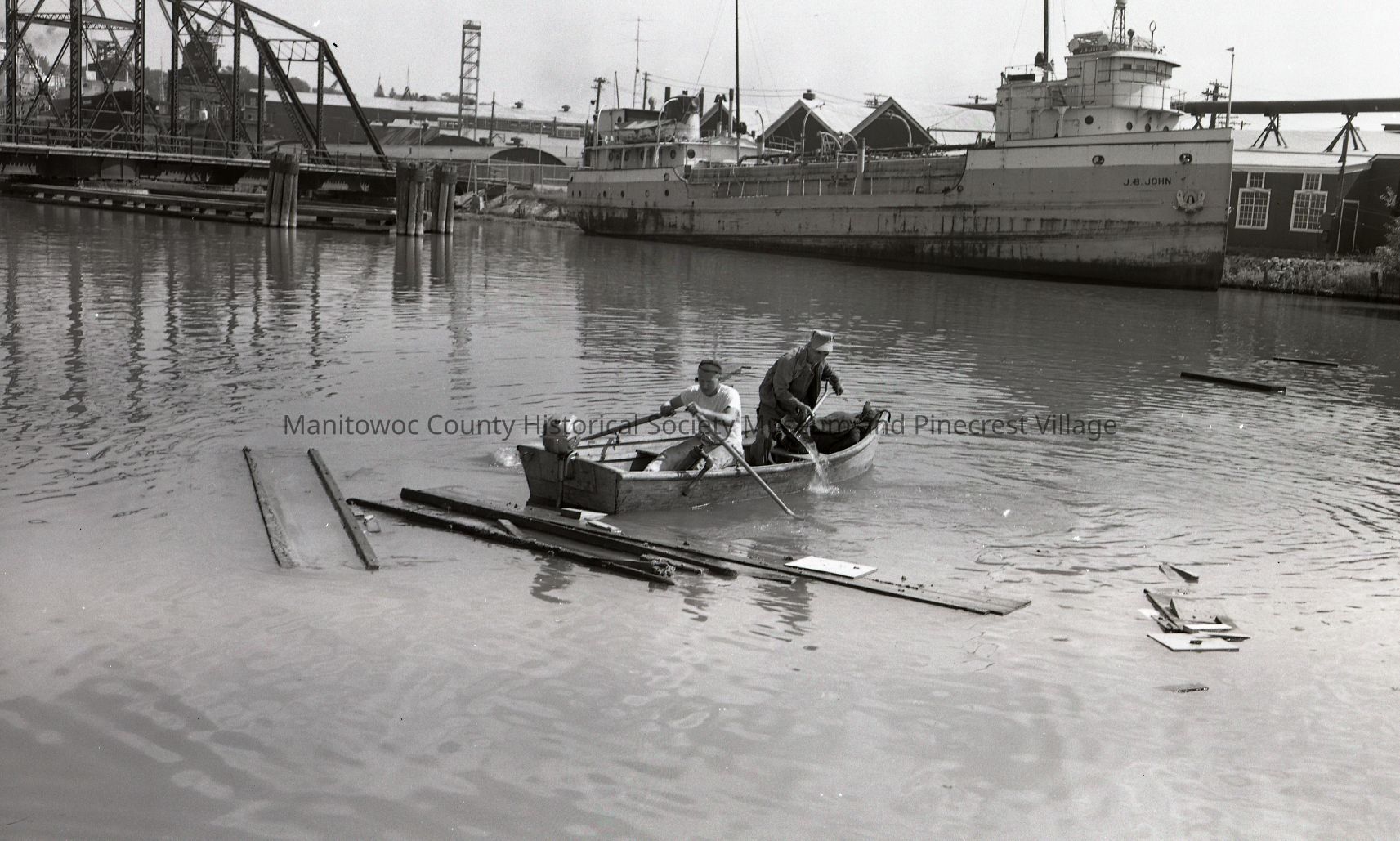 J.B. John cement boat docked at southwest end of Manitowoc Shipbuilding at Soo Line RR swing bridge. Circa 1960.