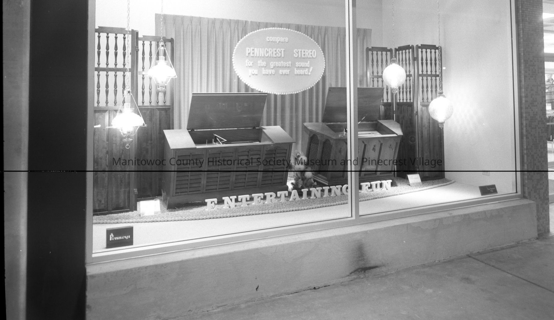 Mid-Cities Mall, 828 Memorial Drive Manitowoc; window display for entertainment center at J.C. Penny. Photograph taken on August 1st, 1968.Made/Created