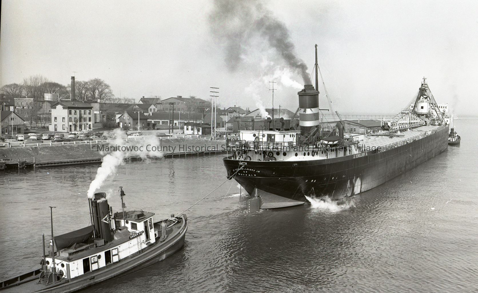 J.F. Schoelfkopf Jr. being guided out of Manitowoc by the tugs Sheboygan and Green Bay. Commercial Street is at left. Photograph taken on April 5th, 1955.