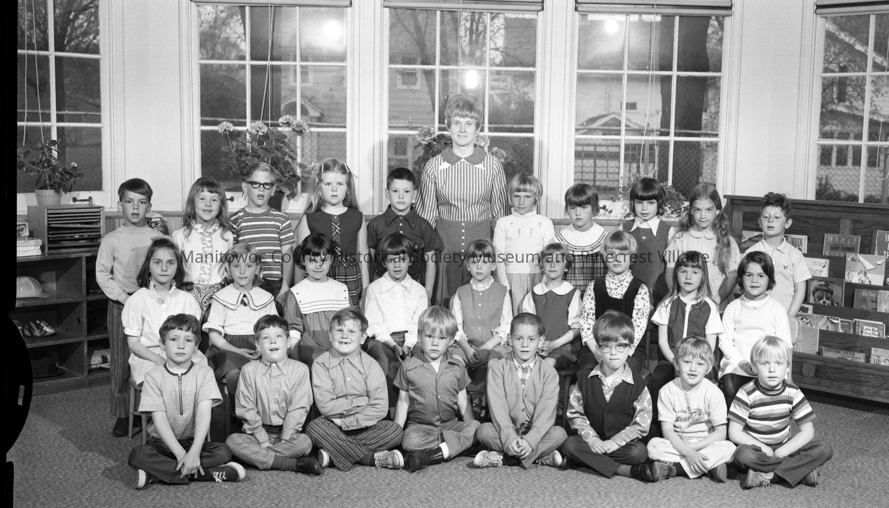 School - Jefferson, 1402 Manila Street Manitowoc; kindergarten class; homes in window are on South14th Street. Photograph taken in May 1971.Made/Created