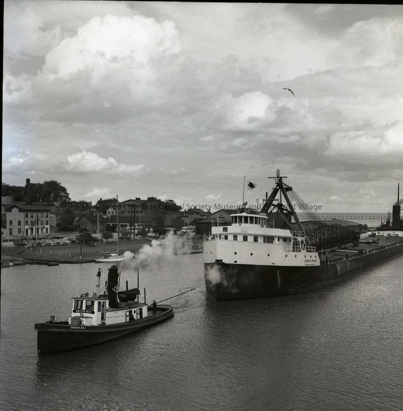 John A. Kling loaded, being towed up river by tug Green Bay. At right is Commercial Street. Photograph taken in 1952.