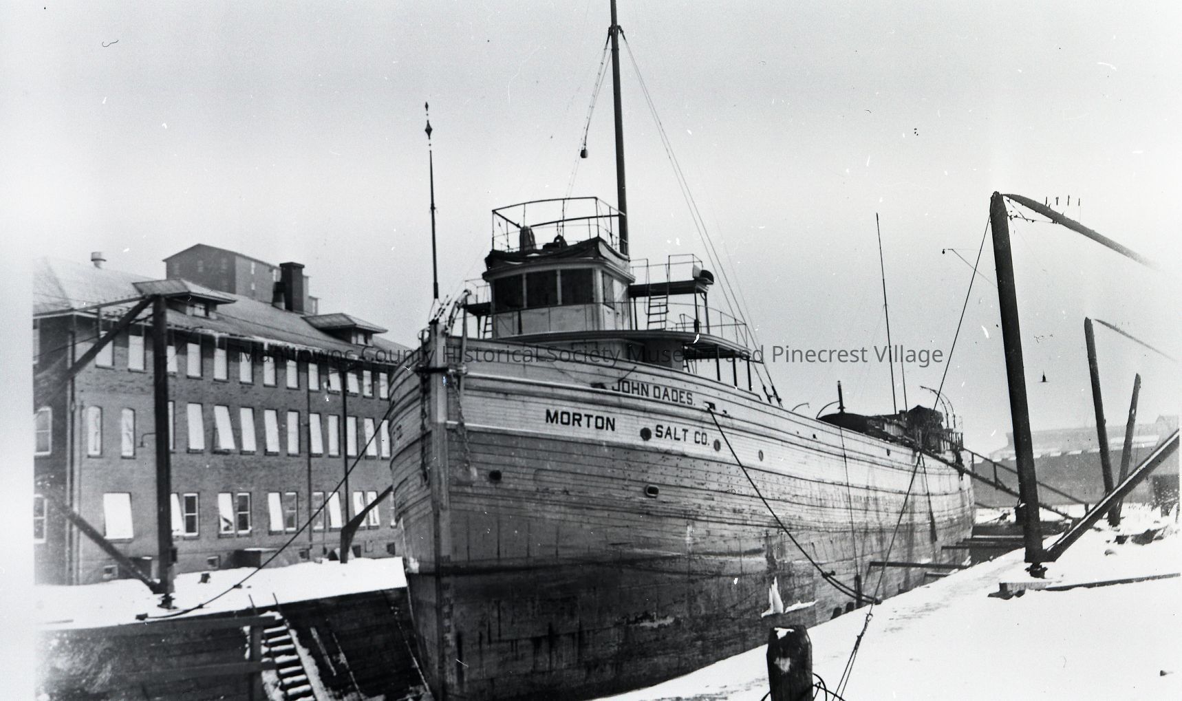 John Dades in old dry dock at Manitowoc Shipbuilding. Building at left is an old office. Circa 1920.