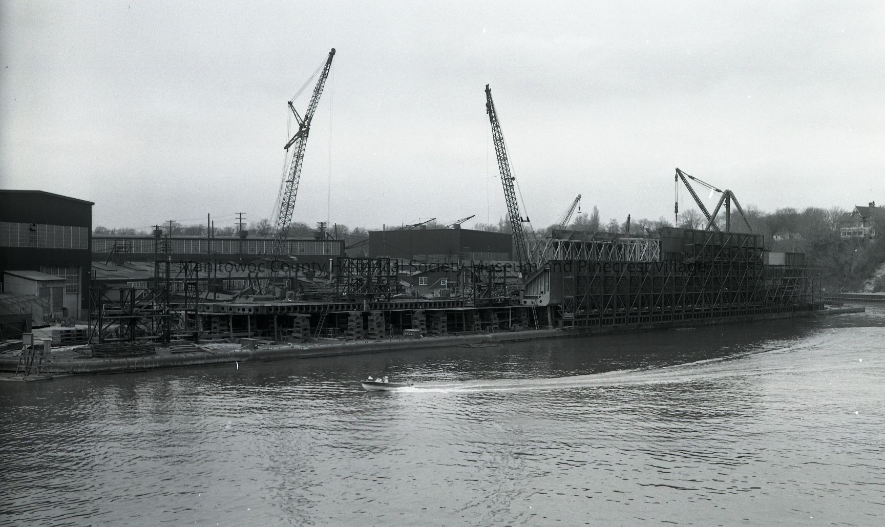 John G. Munson being built at Manitowoc Shipbuilding. At hill top at right is the old John Schuette home, 628 North Water Street. Circa 1951.Made/Created