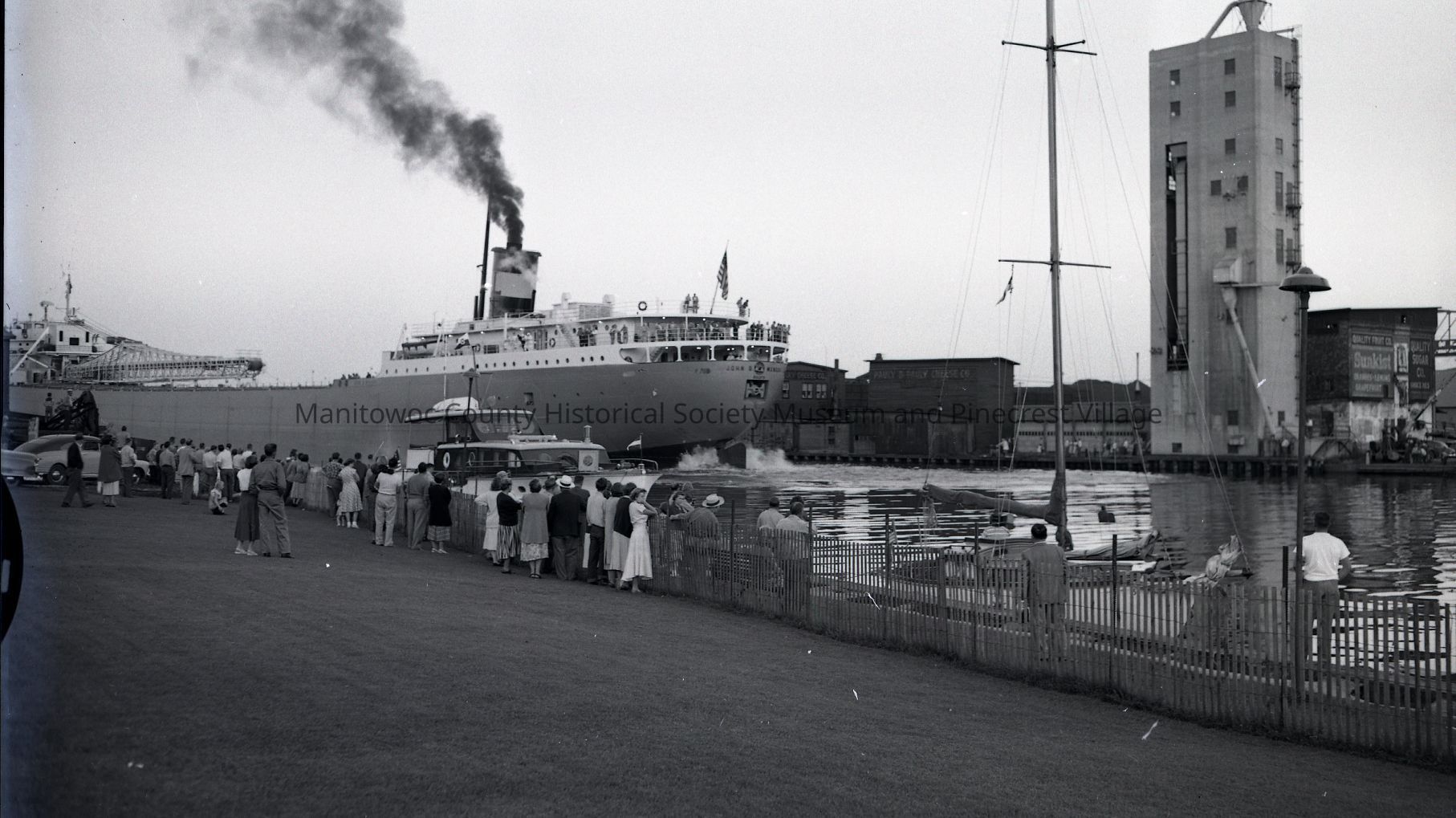John G. Munson going out for tests after being built at Manitowoc Shipbuilding. At right is Pauly & Pauly Cheese Co., Rahr Malting Elevator and Quality Fruit Co. on Quay Street. Photograph taken on August 12th, 1952.Made/Created