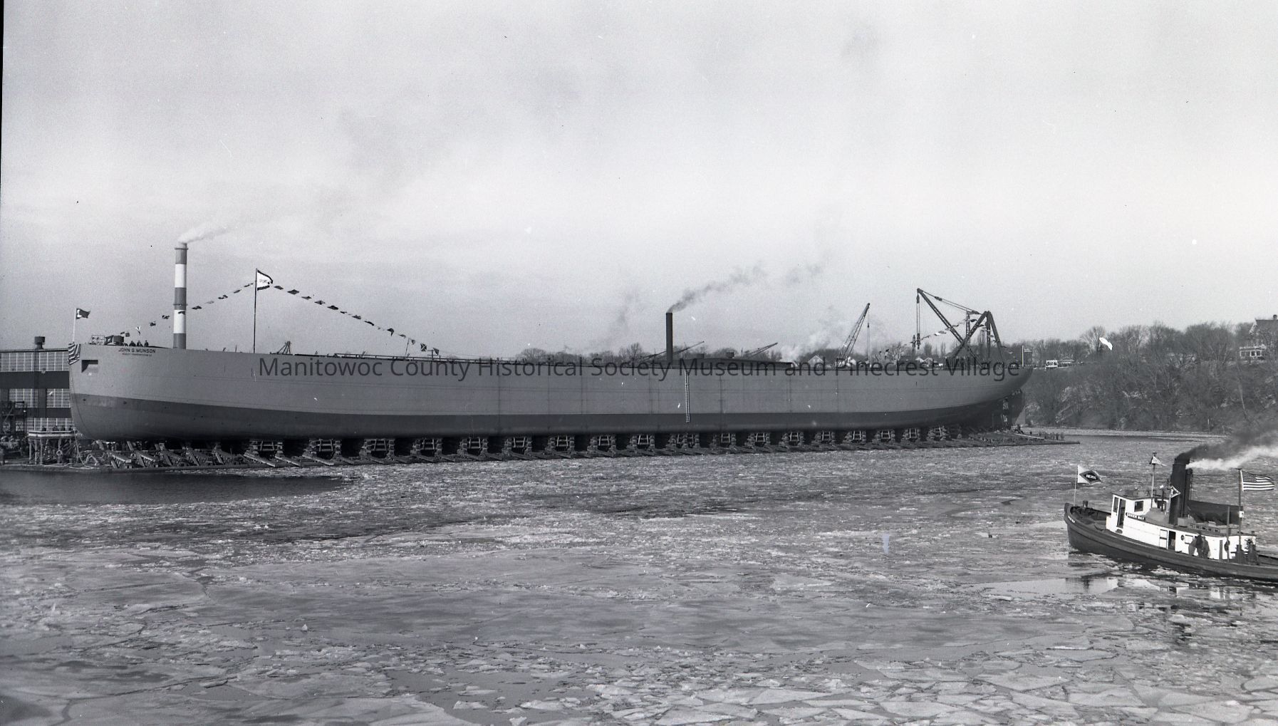 John G. Munson about to slide into Manitowoc River. Tug Green Bay is breaking ice and will help push boat back to dock after launch. Photograph taken on December 1st, 1951.Made/Created