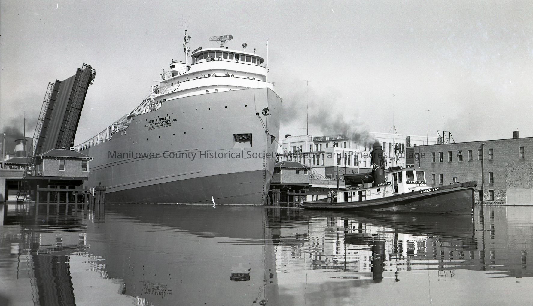 John Munson going through 8th Street bridge. At right are the Boston Store and Sears Roebuck store. Photograph taken on August 13th, 1952.Made/Created