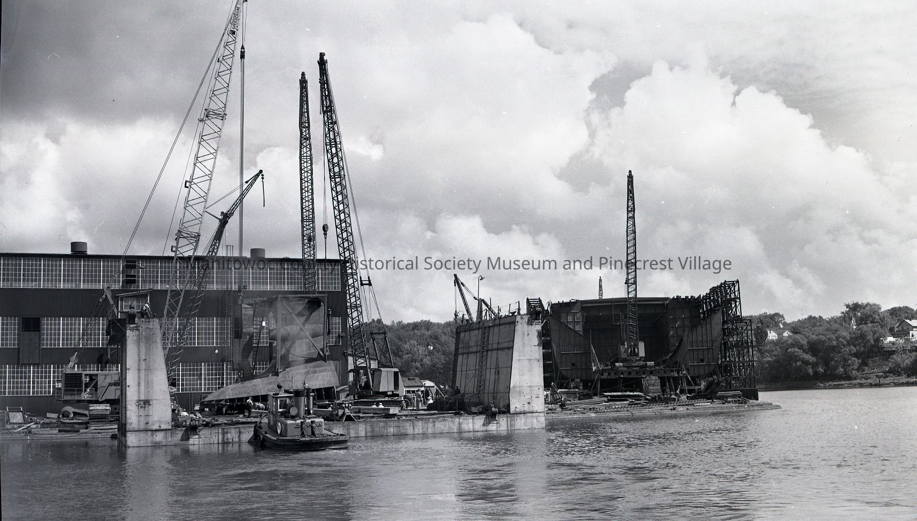 John Munson, in dry dock, stern section to be moved over to hull at right and attached. Photograph taken on August 18th, 1951.Made/Created