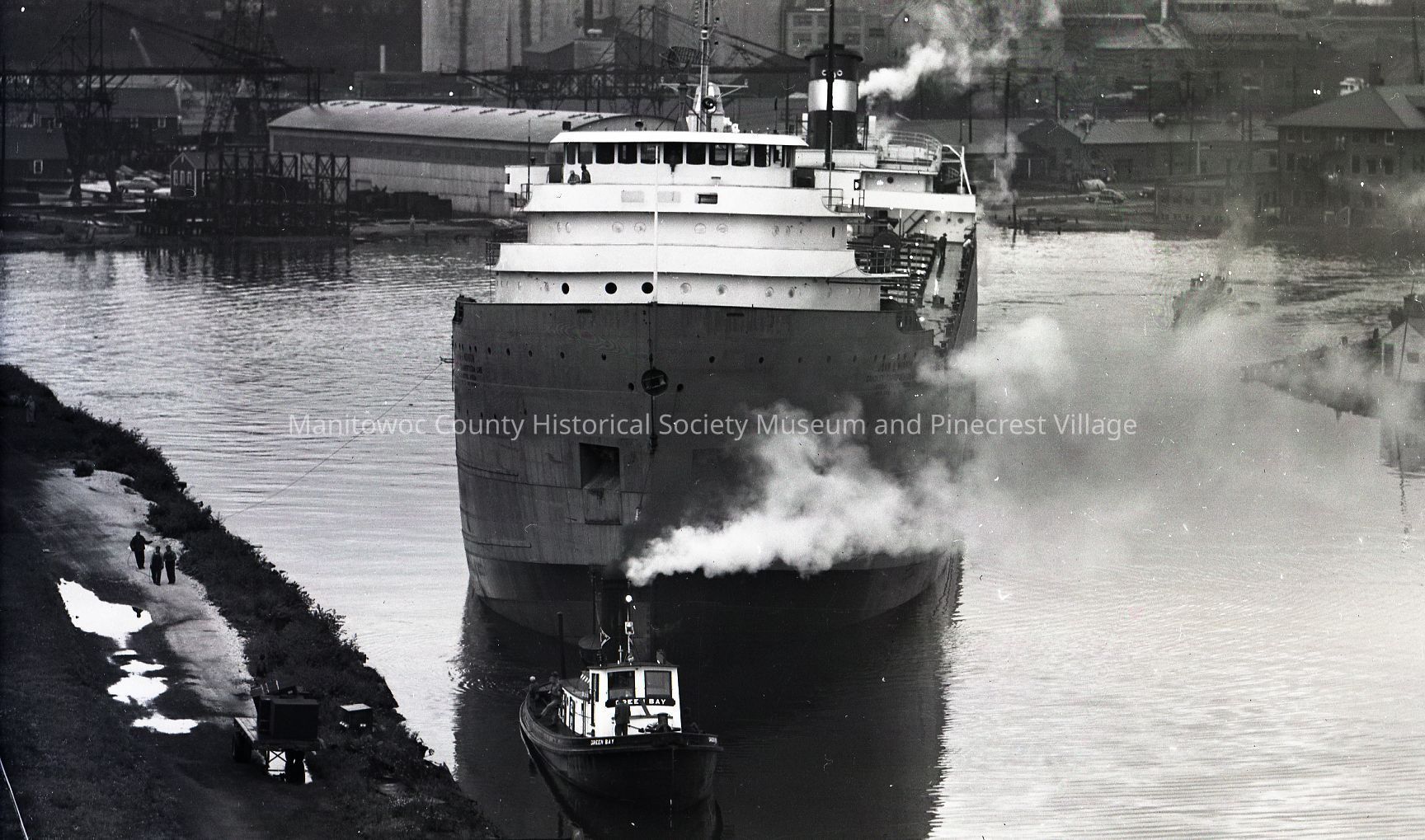 John Munson being helped by tug Green Bay through the jacknife bridge. Photograph taken on August 8th, 1952.